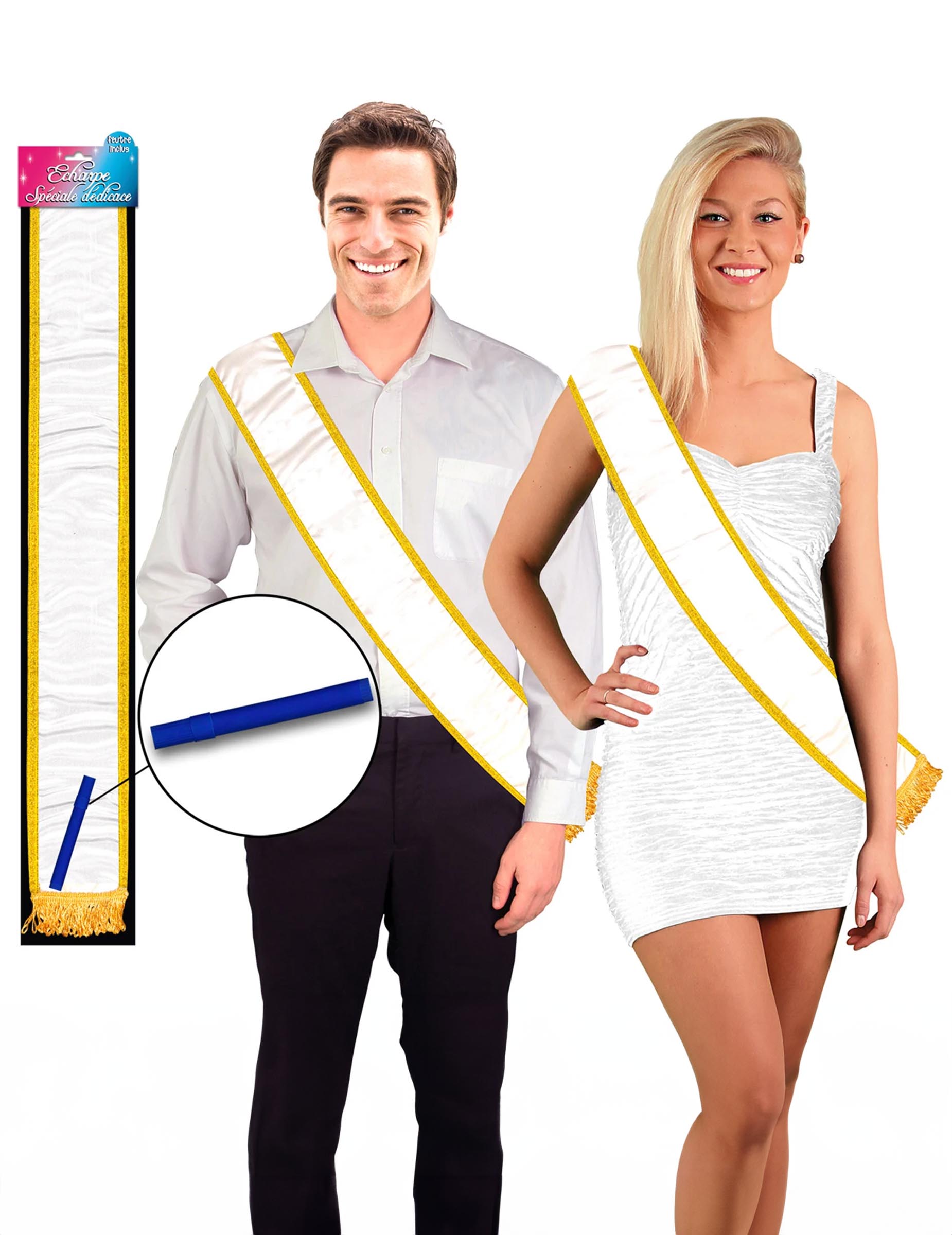 Deveniți înalta autoritate a serii voastre cu această eșarfă domnișoară. Acesta este alb cu granițe aurii. Măsoară aproximativ 180 cm lungime și poate fi personalizat folosind un pâslă albastră. Distrează -te la următoarea ta întâlnire de familie sau pentru o zi de naștere!