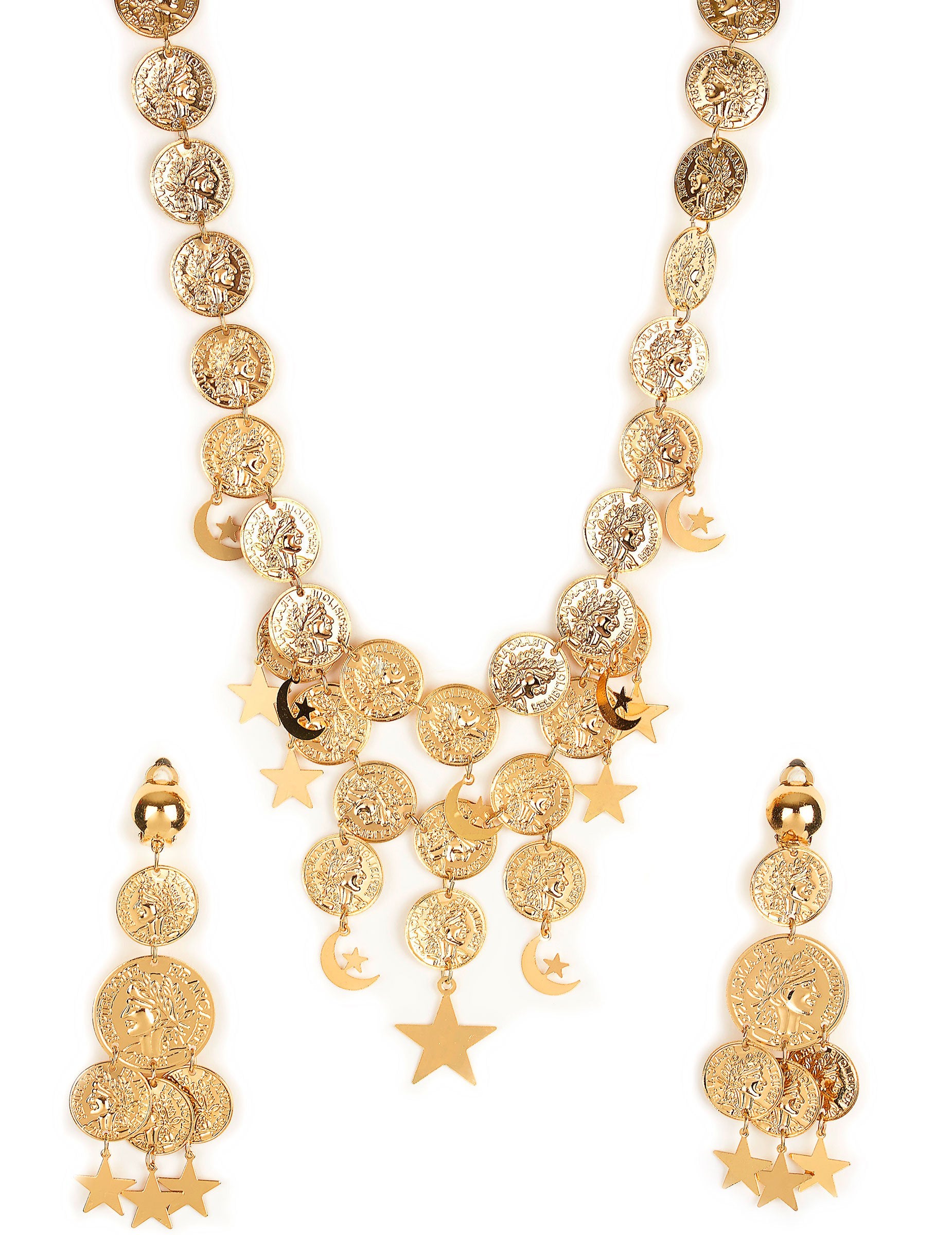 Acest kit de bijuterii boemice este format dintr -un colier și o pereche de cercei. Colierul este alcătuit din acoperișuri de aur, lungi mici și stele. Se închide datorită unei carabinele. Cerceii potriviți constau din mici piese și stele din metal auriu. Se închid folosind un clip. Aceste bijuterii vor fi perfecte pentru completarea unui costum boem pentru carnaval. Copyright Widmann Srl
