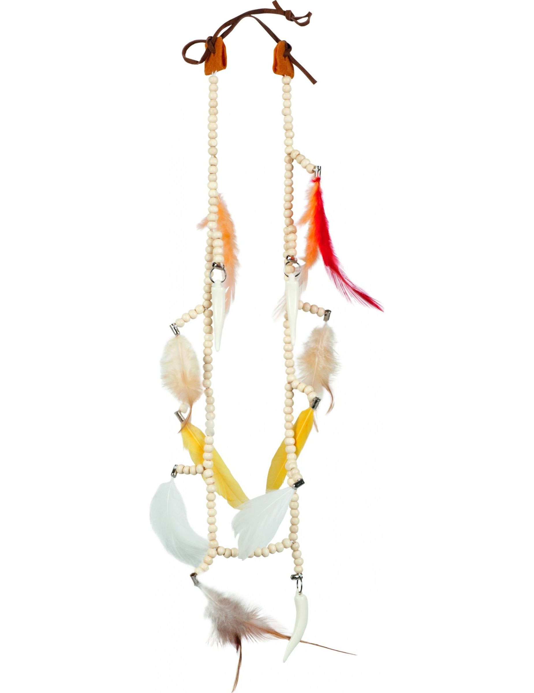 Acest colier indian pentru adulți este alcătuit din perle mici de lemn ușor. Este decorat cu pene colorate din dinți din plastic. Acesta din urmă are o lungime totală de aproximativ 90 cm. Acest accesoriu va fi perfect pentru completarea unui costum indian în timpul unei seri de vest sau cu ocazia carnavalului.