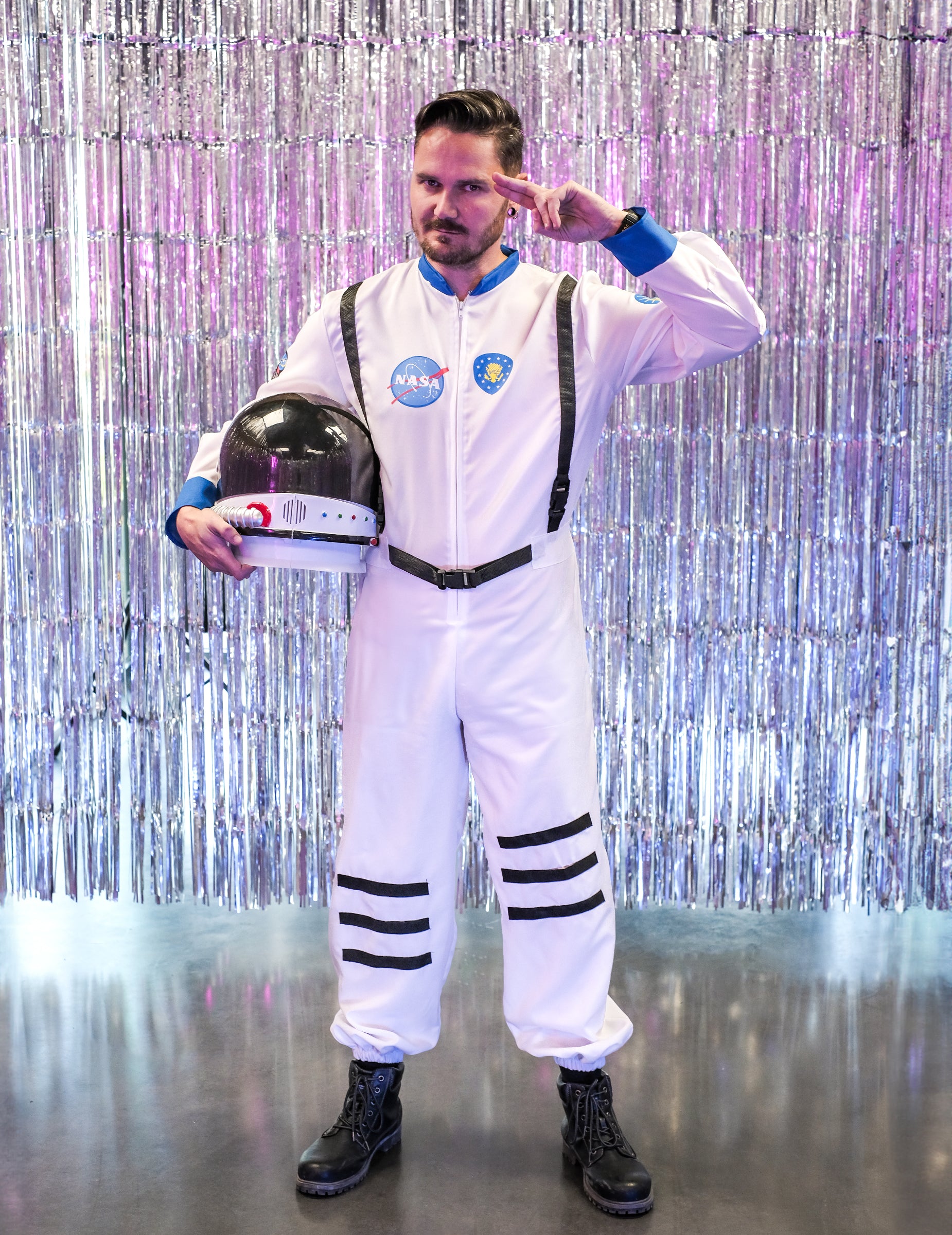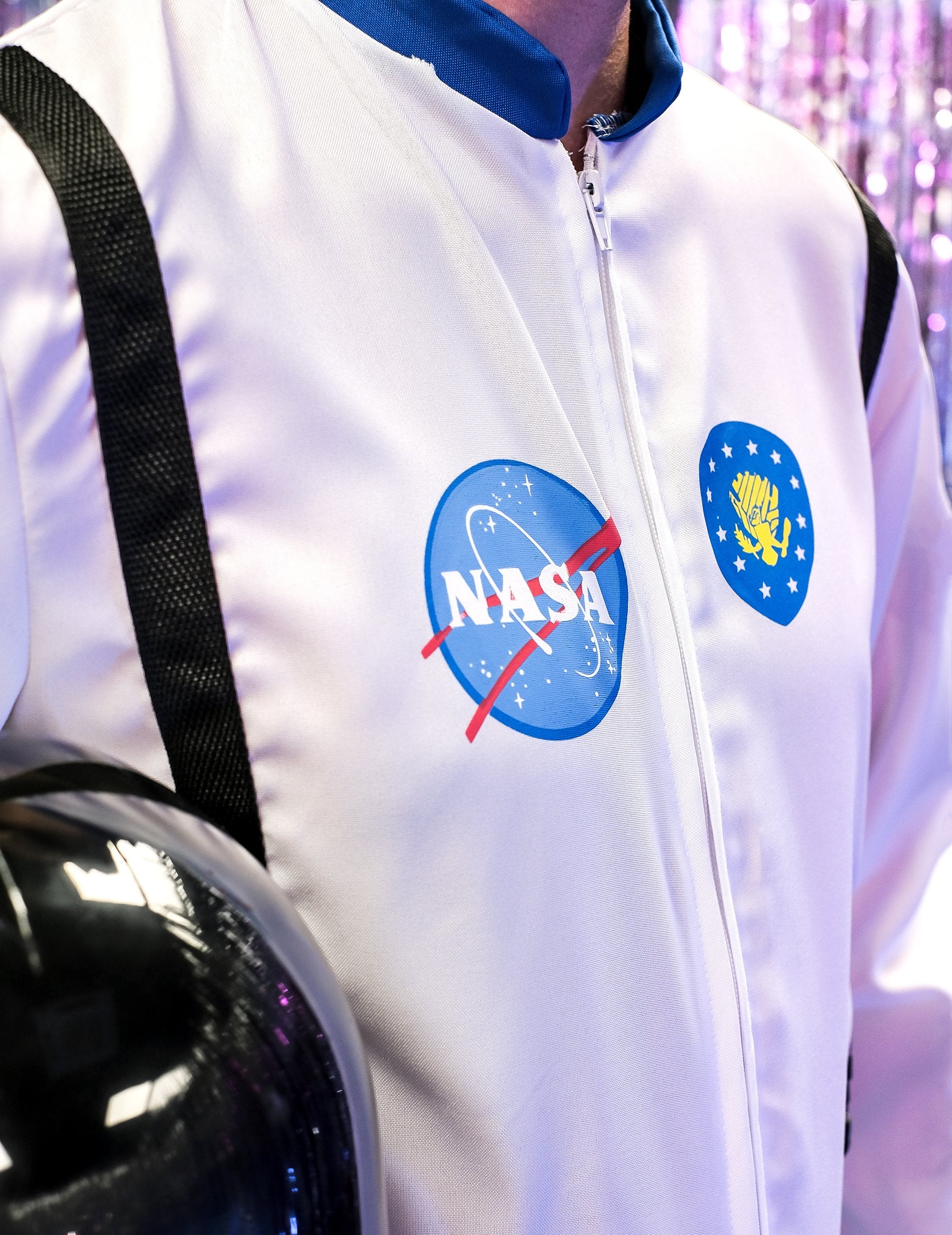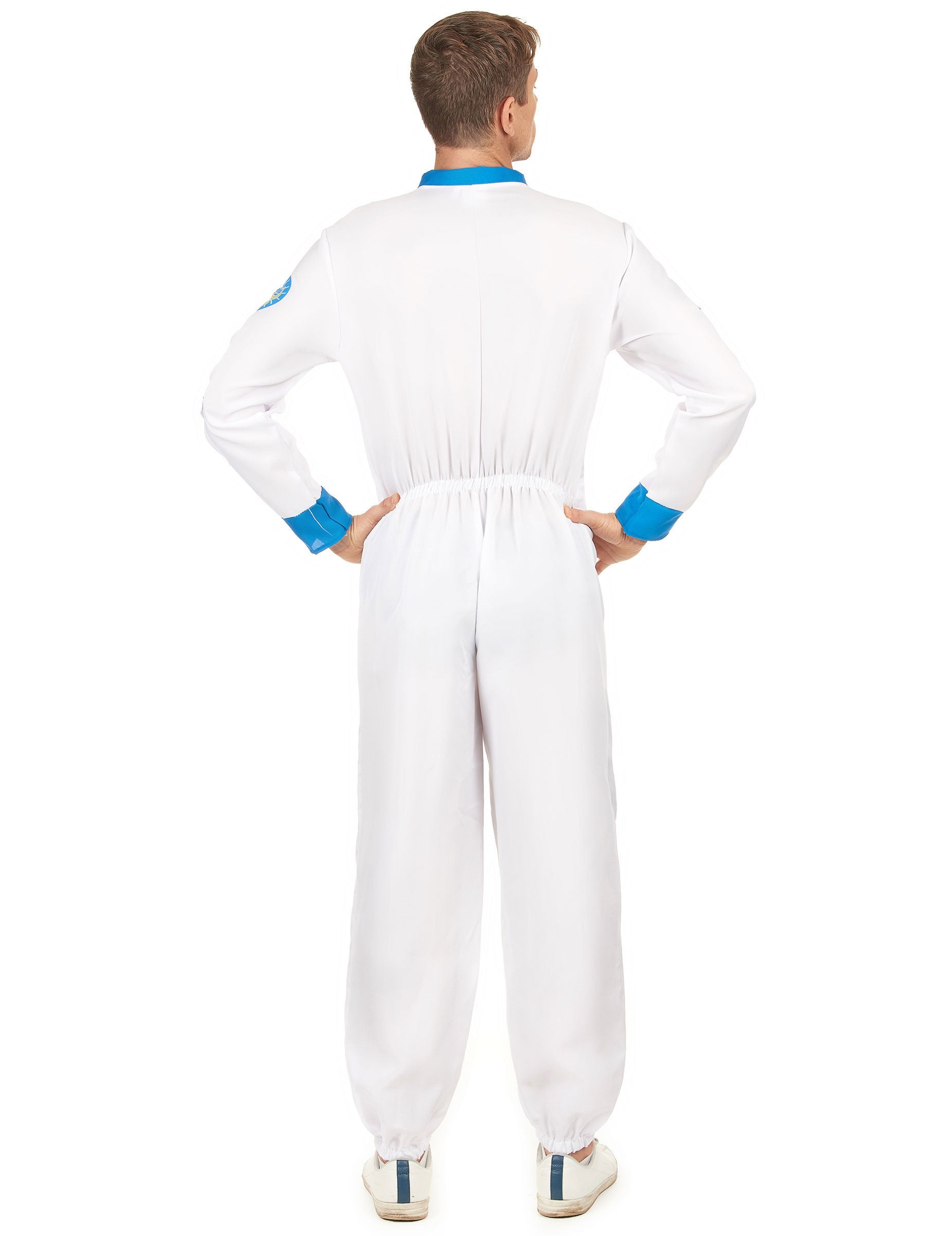 Acest costum cosmonaut pentru bărbați constă dintr -o combinație (pantofi și cască nu sunt incluse). Această combinație este alb cu gulerul și încheieturile albastre. Logo -urile NASA sunt prezente la nivelul bustului. Curelele negre sunt, de asemenea, fixate în partea din față a combinației. Această combinație se închide în față folosind un fermoar. Acest costum va fi perfect pentru a cuceri spațiul în timpul unei seri deghizate cu prietenii sau pentru carnaval.