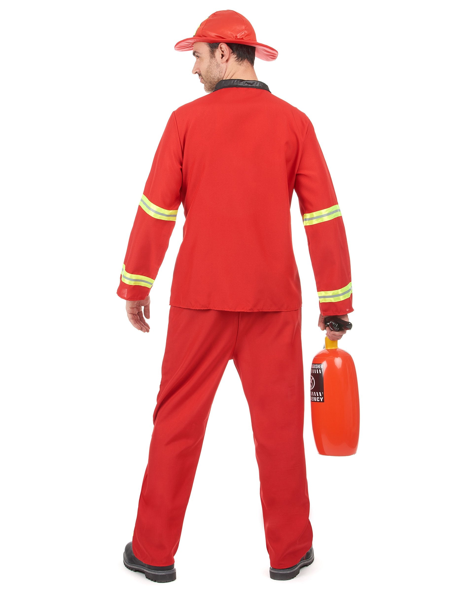 Acest costum de pompier pentru bărbați este format dintr -o geacă, pantaloni și o pălărie (topor și pantofi nu sunt incluse). Jacheta este roșie cu benzi galbene fluorescente pe bust și mâneci. Aceste benzi sunt închise prin agrafe mari din plastic negru. Acest sacou are și un guler negru. Benzile negre împodobesc mijlocul sacoului și se apropie datorită zgârieturilor. Pantalonii potriviți sunt roșii. Are panouri gri la genunchi, precum și benzi galbene de neon. Este elastic din punct de vedere al mărimii. Pălăria, de asemenea, în culoare roșie, are un imprimeu galben reprezentând un ecuson pe care este scris „Fire Fighter”. Acest costum complet va fi perfect pentru a sfida flăcările și a salva vieți pentru o seară deghizată de prieteni.