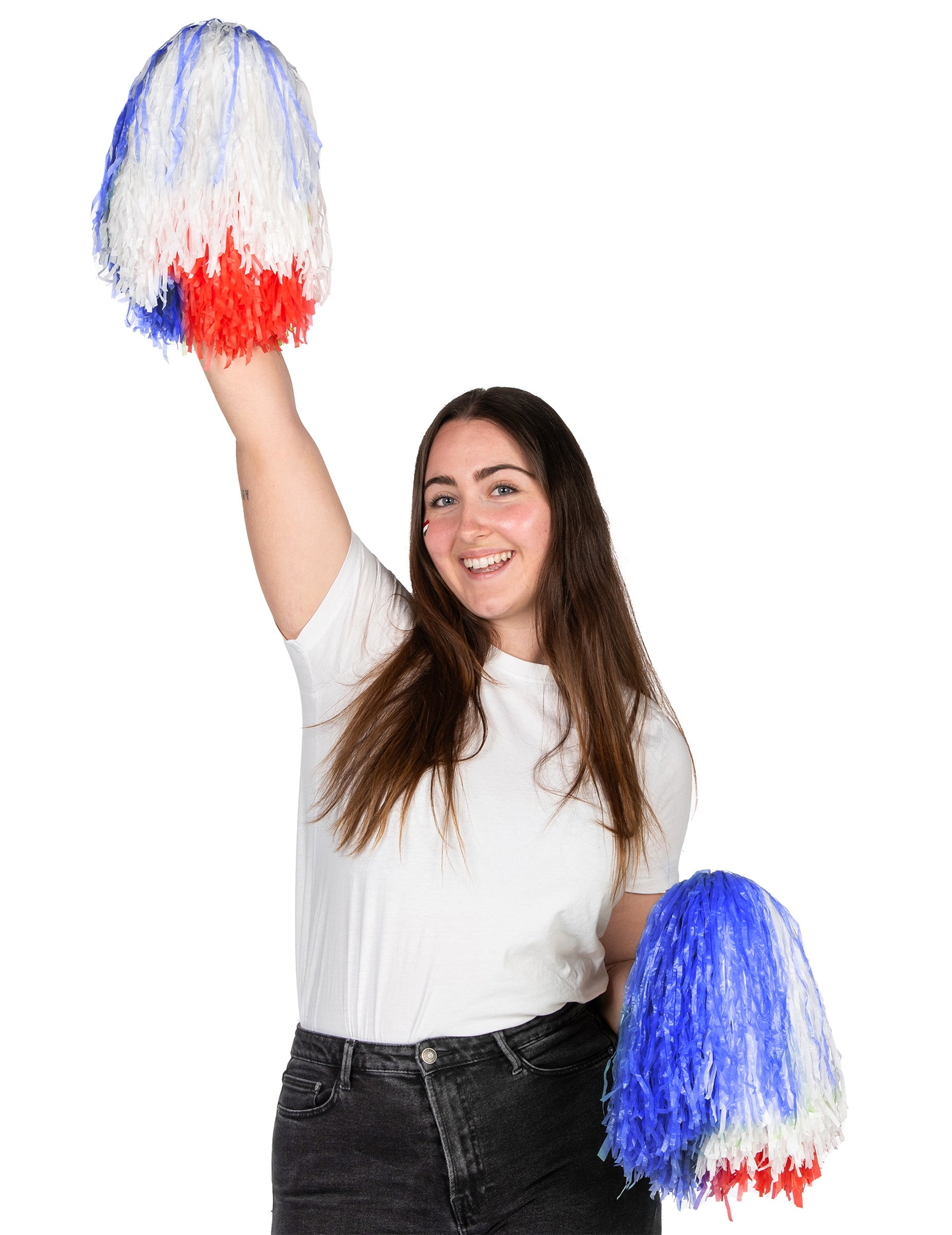 Acest pompom susținător este albastru, alb și roșu. Firurile pompom, în plastic, au o lungime de aproximativ 30 cm. Acest pompom va fi prins cu ușurință folosind 2 inele de plastic alb. În culorile Franței, acest accesoriu va fi perfect pentru a finaliza o deghizare de către Pompom Girl și pentru a sprijini echipa ta de fotbal preferată. Copyright Widmann Srl
