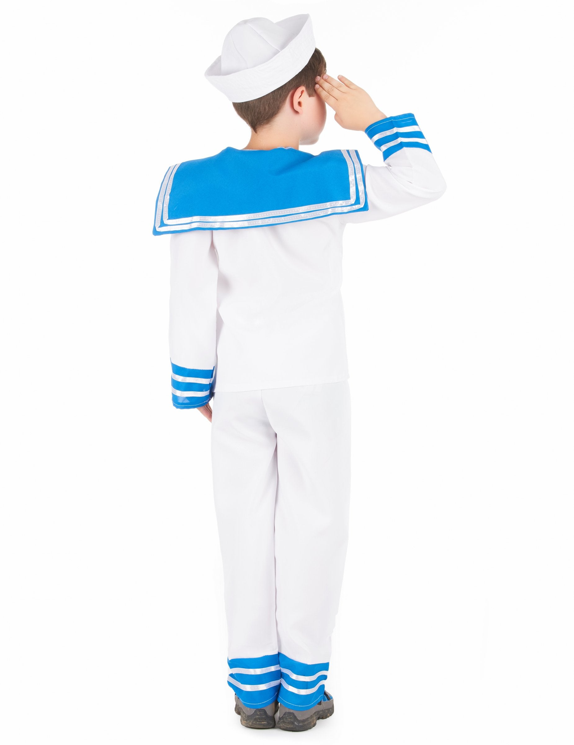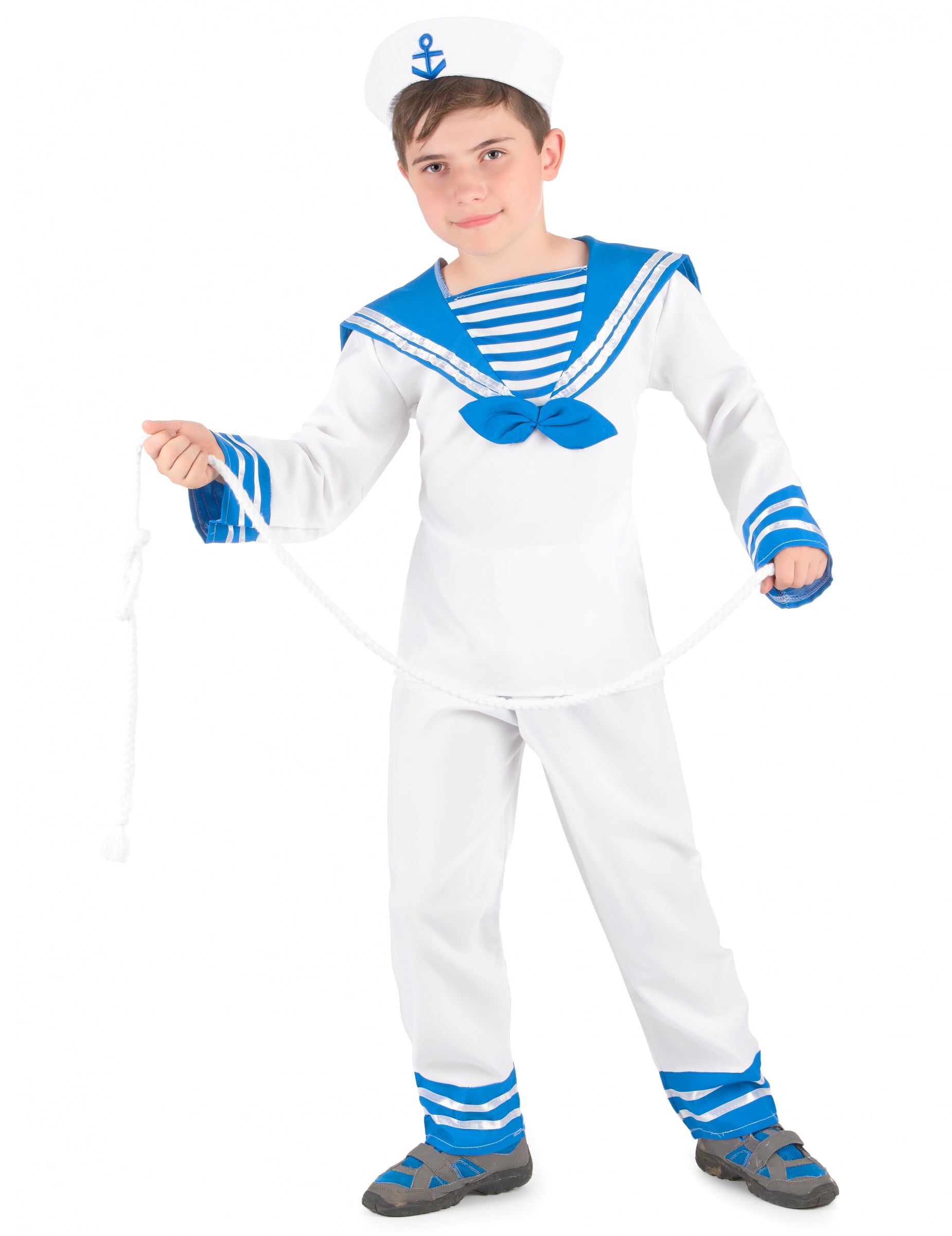 Acest costum marinar pentru băiat este format dintr -un top, pantaloni și o pălărie (pantofi și binoclu nu sunt incluse). Partea de sus a lui lung este alb. Partea inferioară a mânecilor este albastră cu benzi albe din satin. Este prezent și un guler de fructe de mare albastru cu dungi albe. Pantalonii sunt albi, elastici la talie. Partea de jos a acestui pantalon este albastră cu dungi albe. Pălăria marinarului este albă cu o ancoră albastră pe față. Acest costum va fi perfect pentru a juca Mossillons cu ocazia unei petreceri pe tema mării sau pentru carnaval.