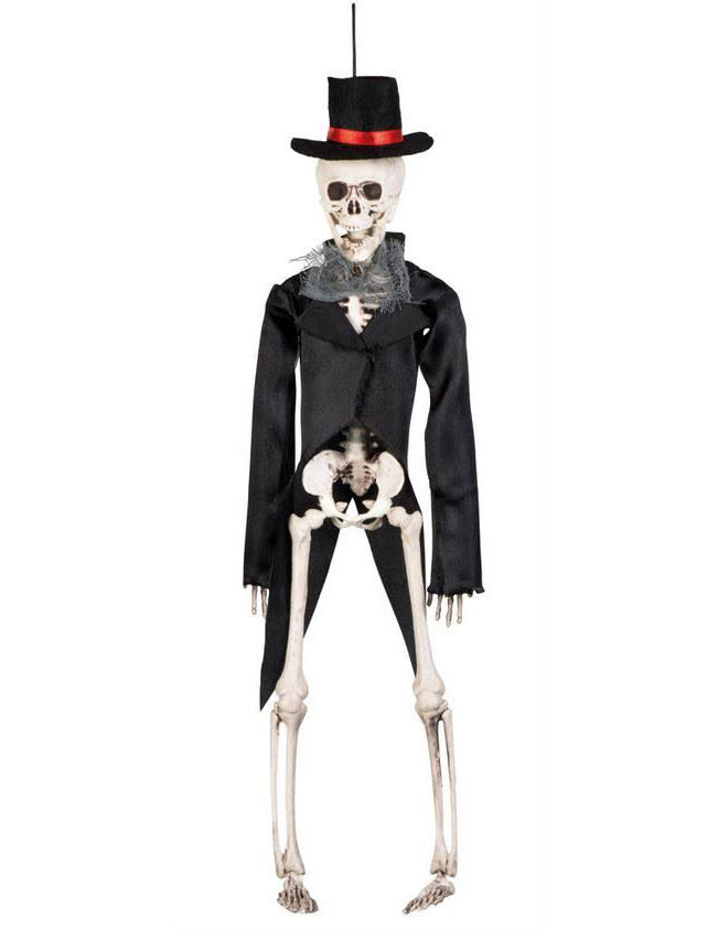 Acest decor suspendat reprezintă un mire de schelet. Scheletul de plastic este îmbrăcat într -un vârf de formă neagră și o geacă de coadă. Pălăria este accesorizată cu o fâșie de țesut gri sau roșu. Culoarea este aleatorie. Acest lucru este articulat în brațe și picioare. O mică legătură este prezentă pe craniul scheletului pentru a -l suspenda cu ușurință. Această decorare gotică măsoară aproximativ 45 x 10 cm. Acest mire schelet va fi perfect pentru a -ți completa decorarea gotică în timpul Halloween -ului sau pentru o seară pe tema groazei.