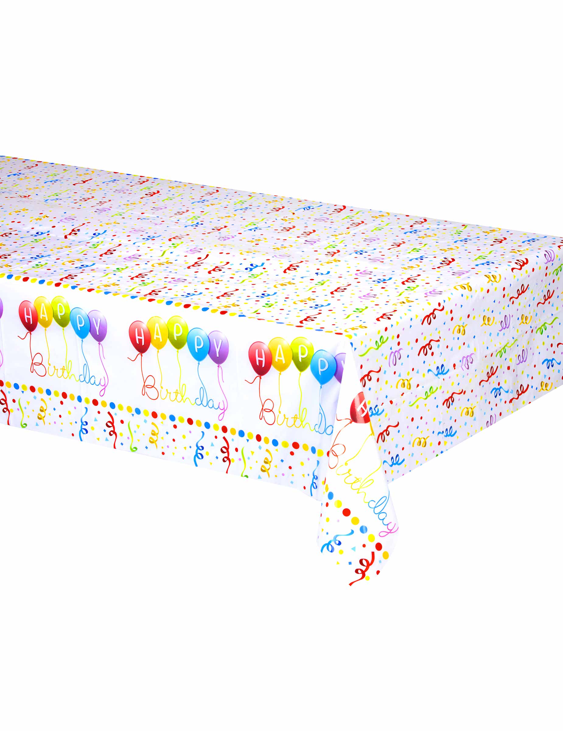 Fundalul său alb este decorat cu modele multicolore variate. În timp ce confetti decorează partea centrală, marginile evidențiază mesajul "happy birthday" alături de baloane. Este alegerea perfectă pentru a completa decorul de aniversare cu o notă de culoare.