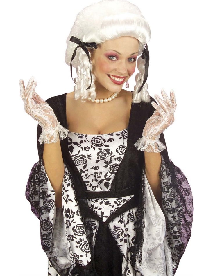 Aceste mănuși scurte pentru adulți sunt în dantelă albă. Acestea au o lungime de aproximativ 25 cm până la maxim. Aceste mănuși de dantelă albă vor fi perfecte pentru completarea unui costum de marchiz pentru o seară barocă sau renascentistă. Copyright Widmann Srl