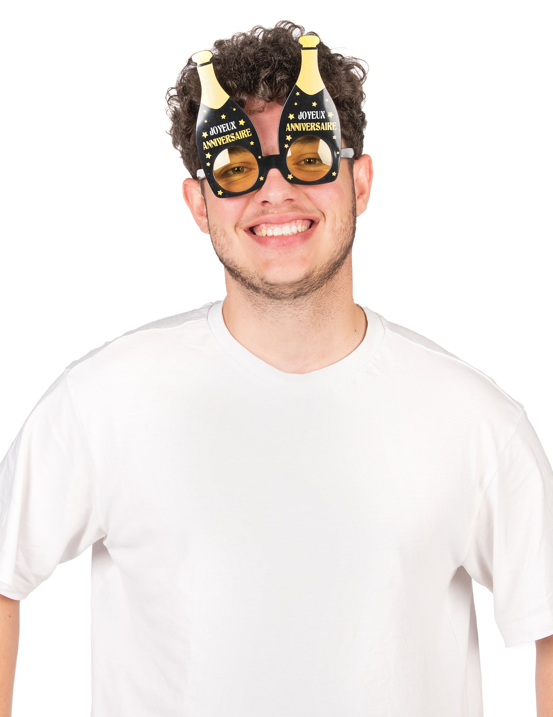 Această pereche de ochelari de naștere pentru adulți este din plastic. Reprezintă 2 sticle de șampanie verde cu blatul cu dungi roșii și galbene, precum și inscripția „La mulți ani!” Înconjurat de stele. Ochelarii acestor pahare au o culoare verde închis; Acest accesoriu va fi perfect pentru a -ți completa ținuta de ziua ta.