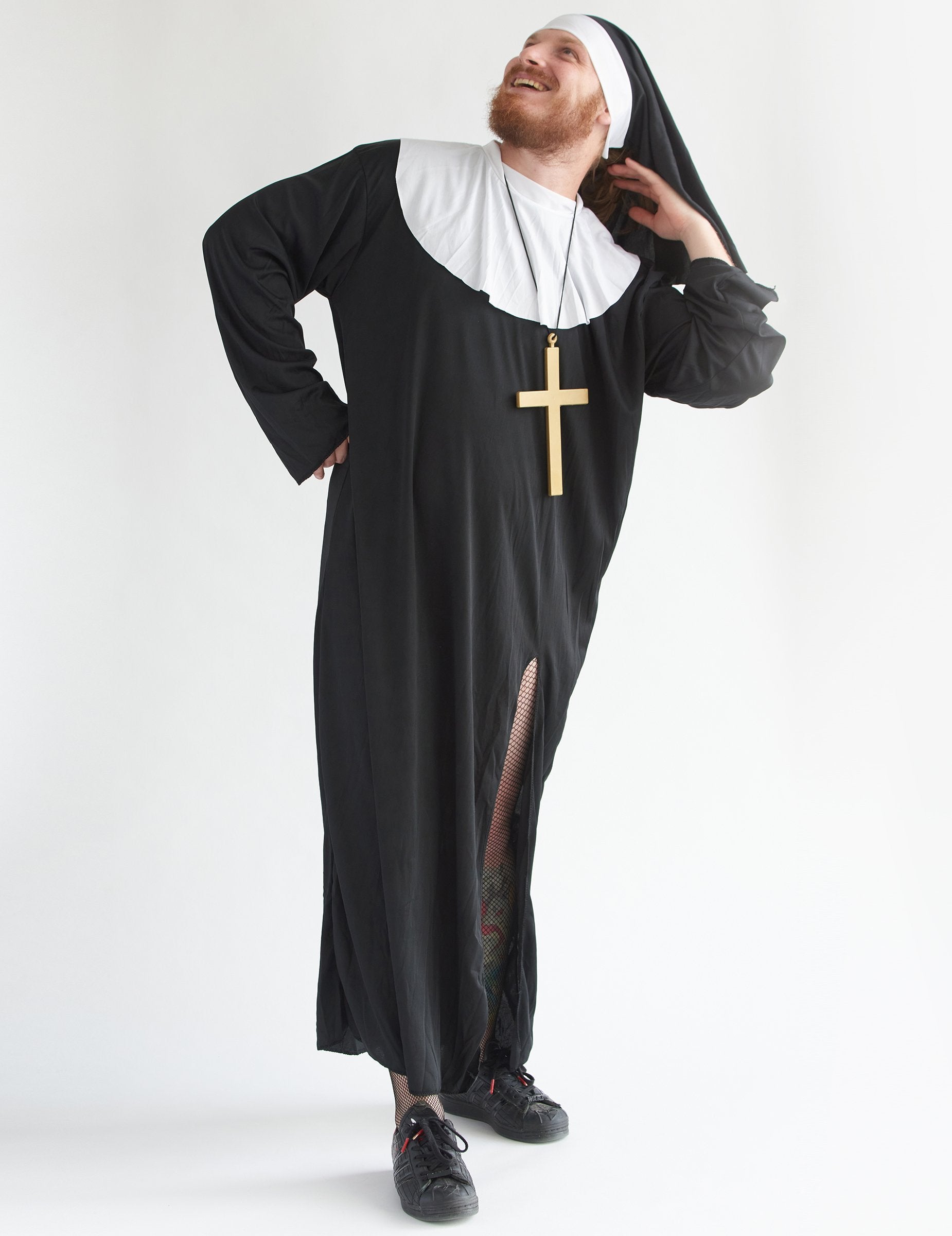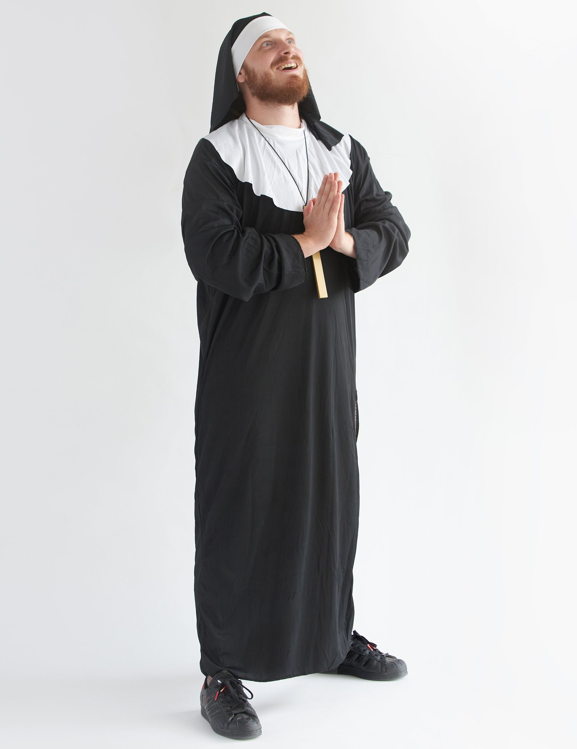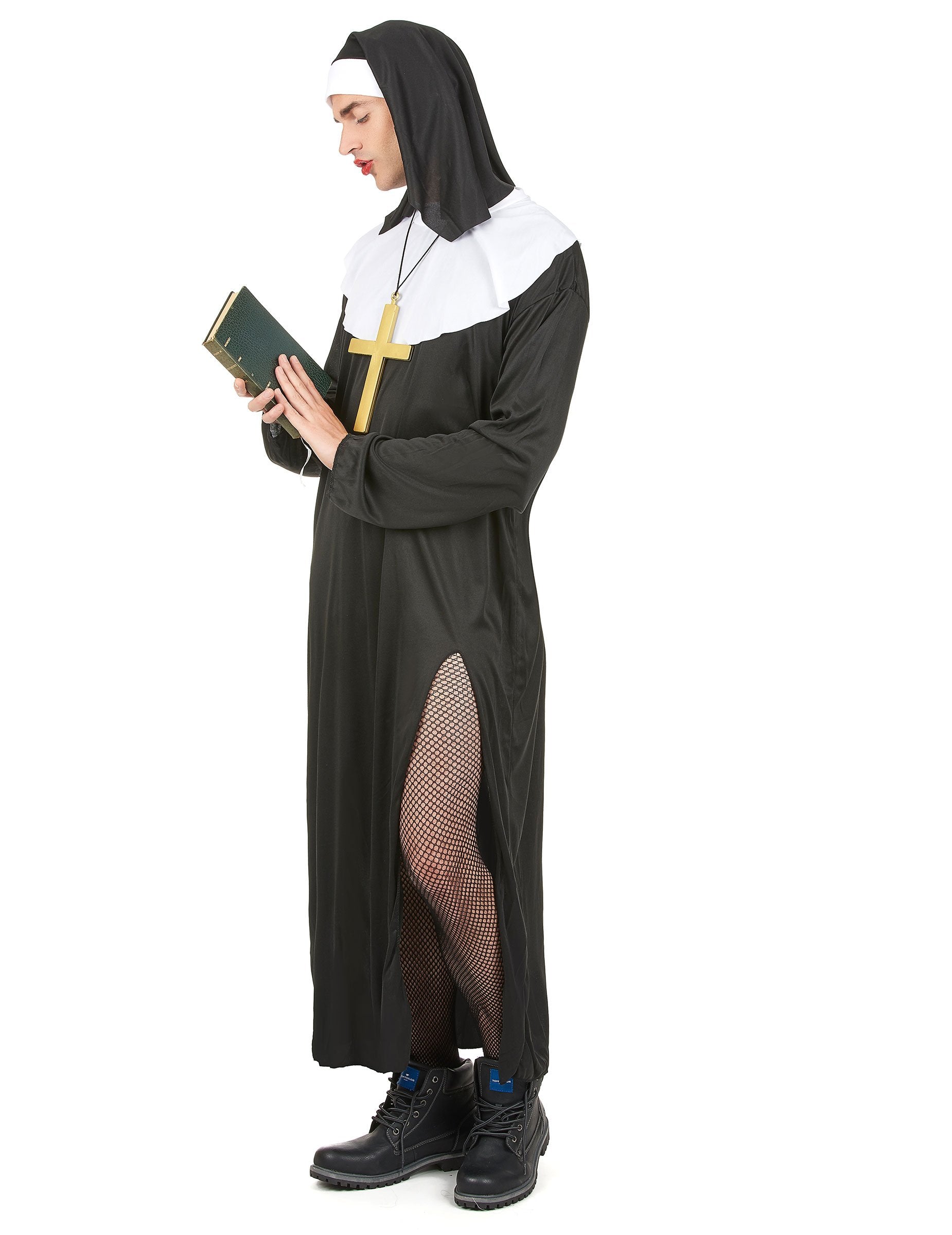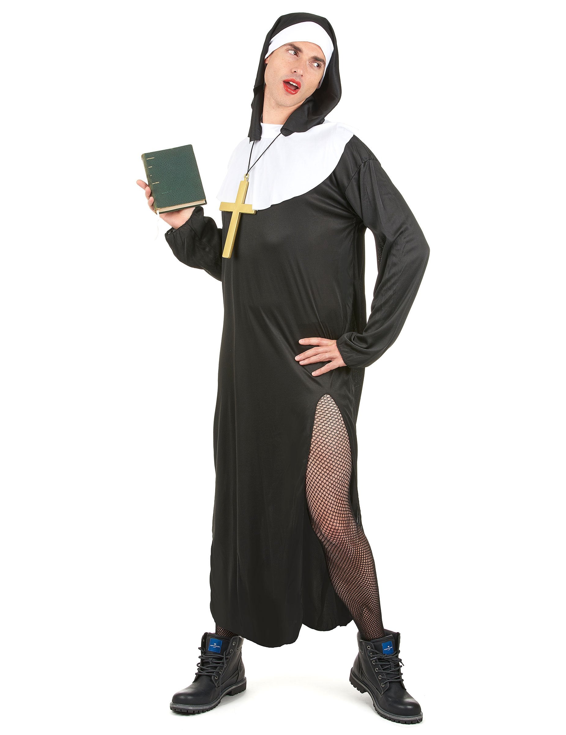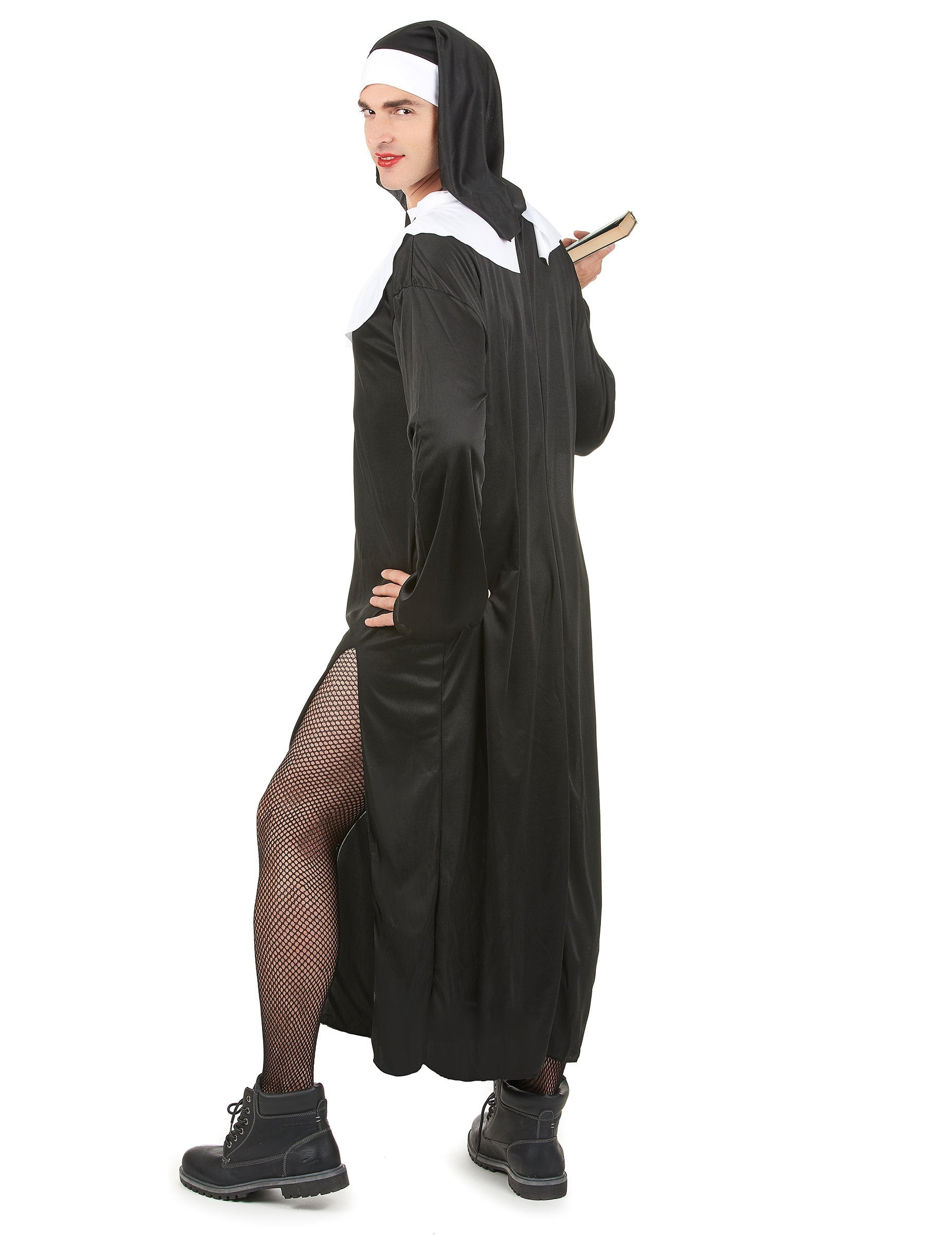 Acest costum pentru adulți este o ținută religioasă pentru bărbați. Este format dintr -o rochie și o șapcă (carte, colanți, încălțăminte și încrucișare nu sunt incluse). Rochia lungă este neagră și se atașează cu un velcro în spatele gâtului. Gulerul alb este tipic obișnuinței. Slotul rochiei până la coapsă este totuși mai puțin clasic. La fel ca faptul că este un om în obișnuință! Capacul este alb -negru pentru a imita vălul pe care îl poartă surorile, este atașat de un elastic. Domnilor, a stabilit tonul umorului în timpul unei seri deghizate, transformându -vă într -un devotat!