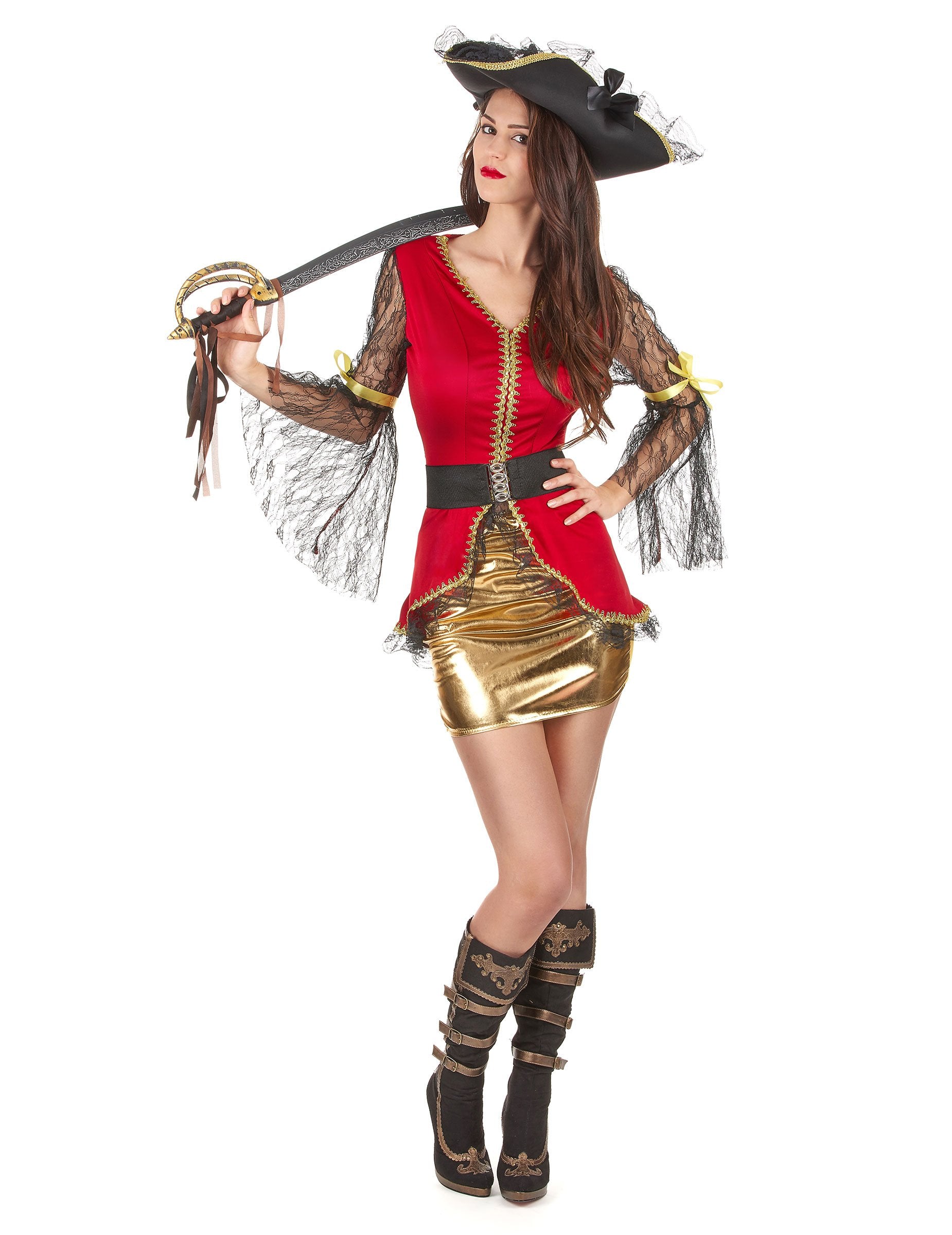 Acest costum pentru adulți reprezintă un pirat sexy. Include o geacă, o fustă, o centură și o pălărie (pantofi și sabre nu sunt incluse). Jacheta este roșie. Cusăturile sunt cusute cu decorațiuni de aur. Dantela neagră este cusută pe toată partea de jos a sacoului, amintind de mâneci. Fusta scurtă este aurii. O centură neagră vă permite să țineți sacoul placat pe fustă. Pălăria neagră are forma unui tricorne clasic al unui filibusier. O bordură de aur și dantelă neagră completează elegant acest costum. În timpul unei seri pe mare, tema sau banditul a pus acest costum de hackeri și spumă de mări.