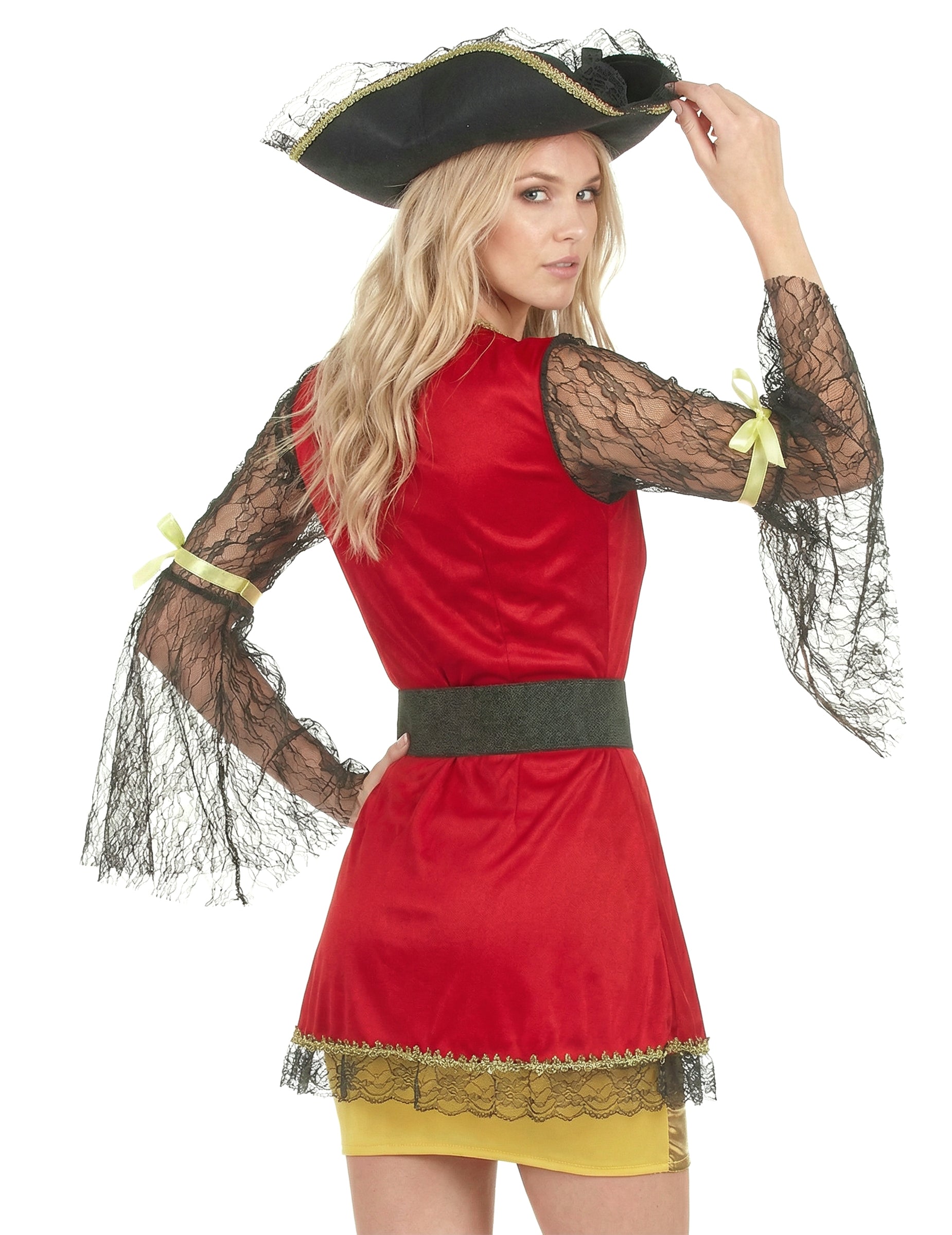 THE pălărie negrul are forma unui tricorn clasic al unui piratO garnitură aurie și dantelă neagră completează elegant acest costum.