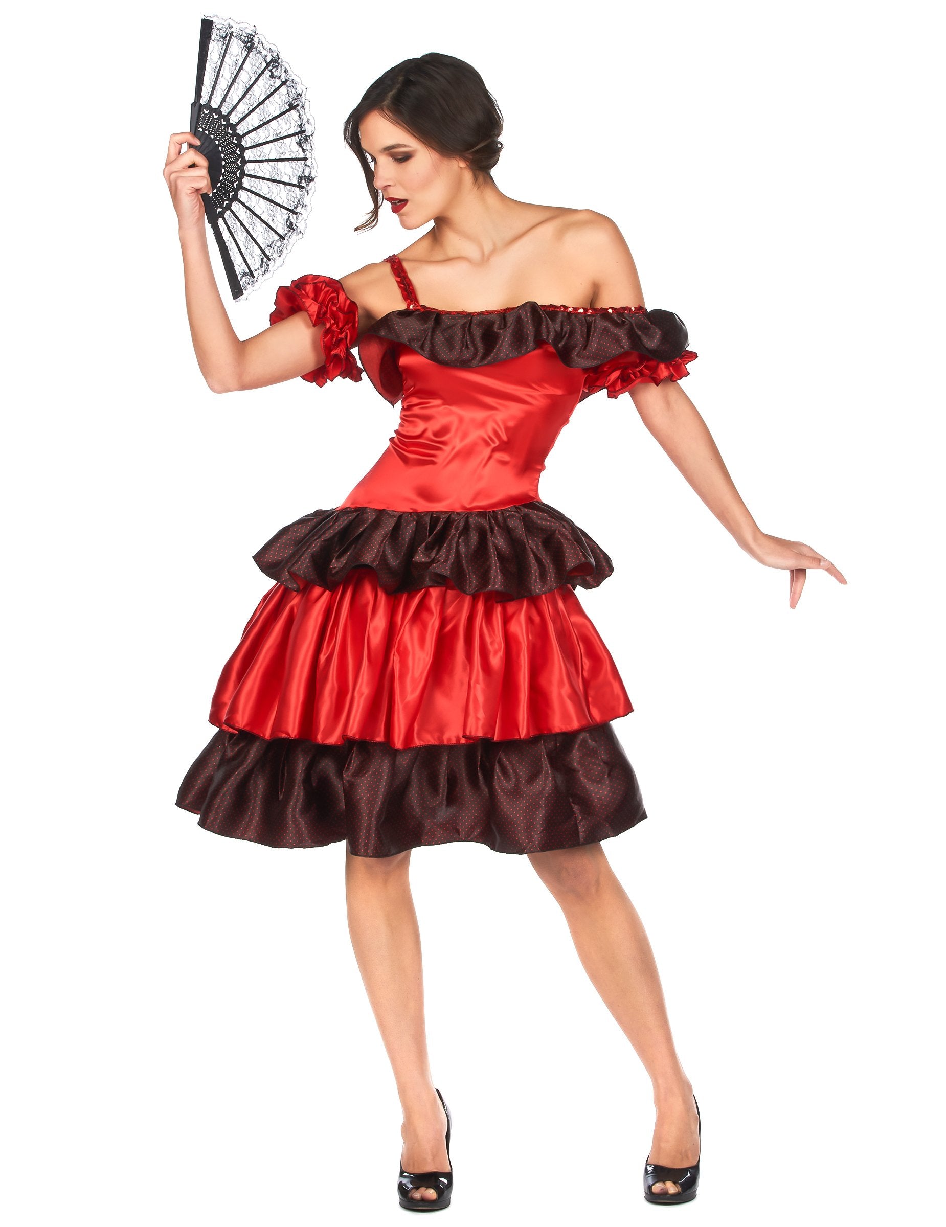 Acest costum pentru adulți evocă un dansator andaluz. Include o rochie, brațe și clipuri de păr (pantofi care nu sunt incluse). Rochia este două -ton. Este alcătuit din mai multe rufe roșii strălucitoare și negre. Gulerul este asimetric cu o singură rampă. Turnurile de brațe negre și roșii în formă de păr elastic trebuie să fie puse pe brațe pentru a completa această ținută. Clestele de păr negru sunt depășite de o floare spumantă de poliester roșu. În timpul unei seri latine sau pentru carnaval, aprindeți camera cu dansuri spaniole!