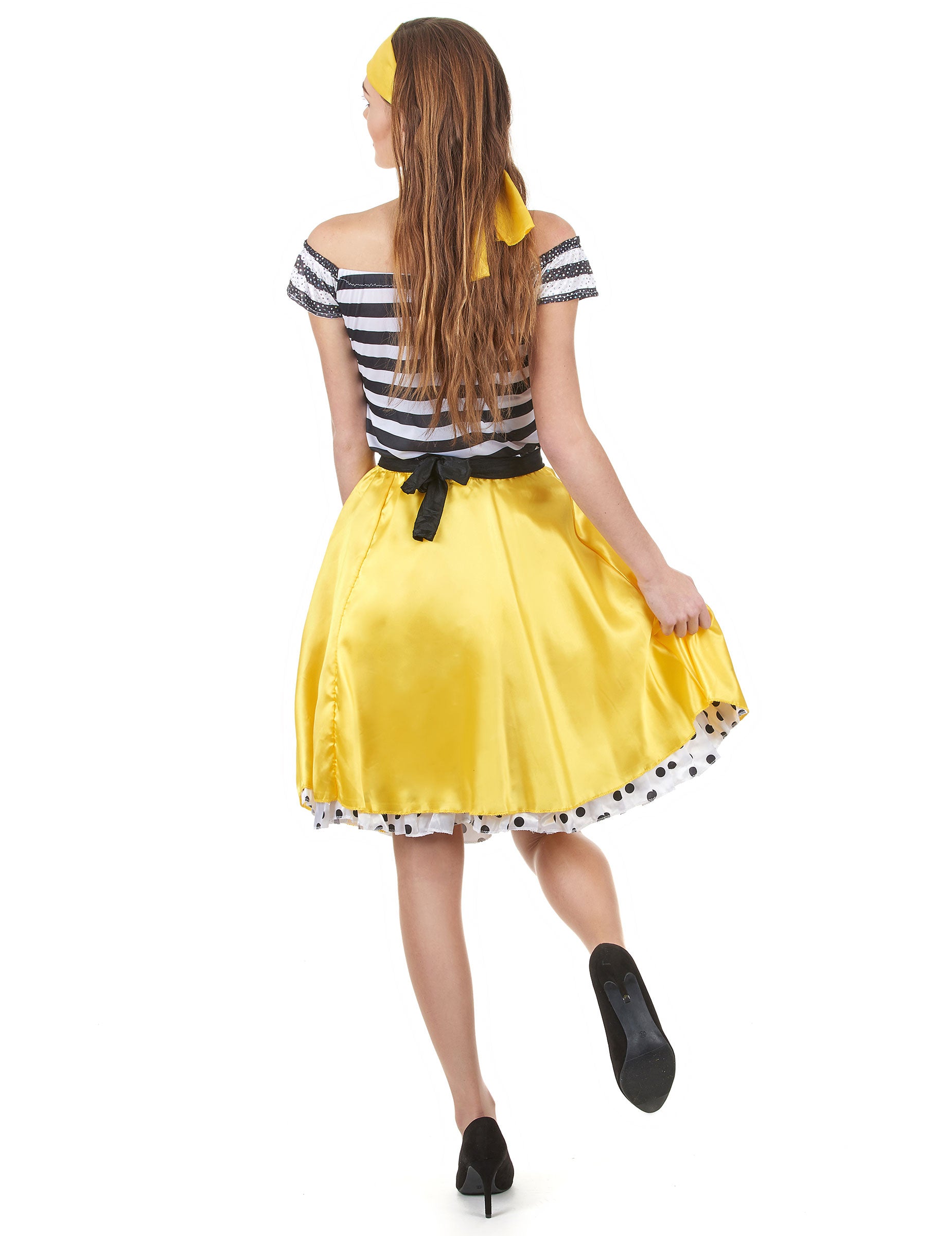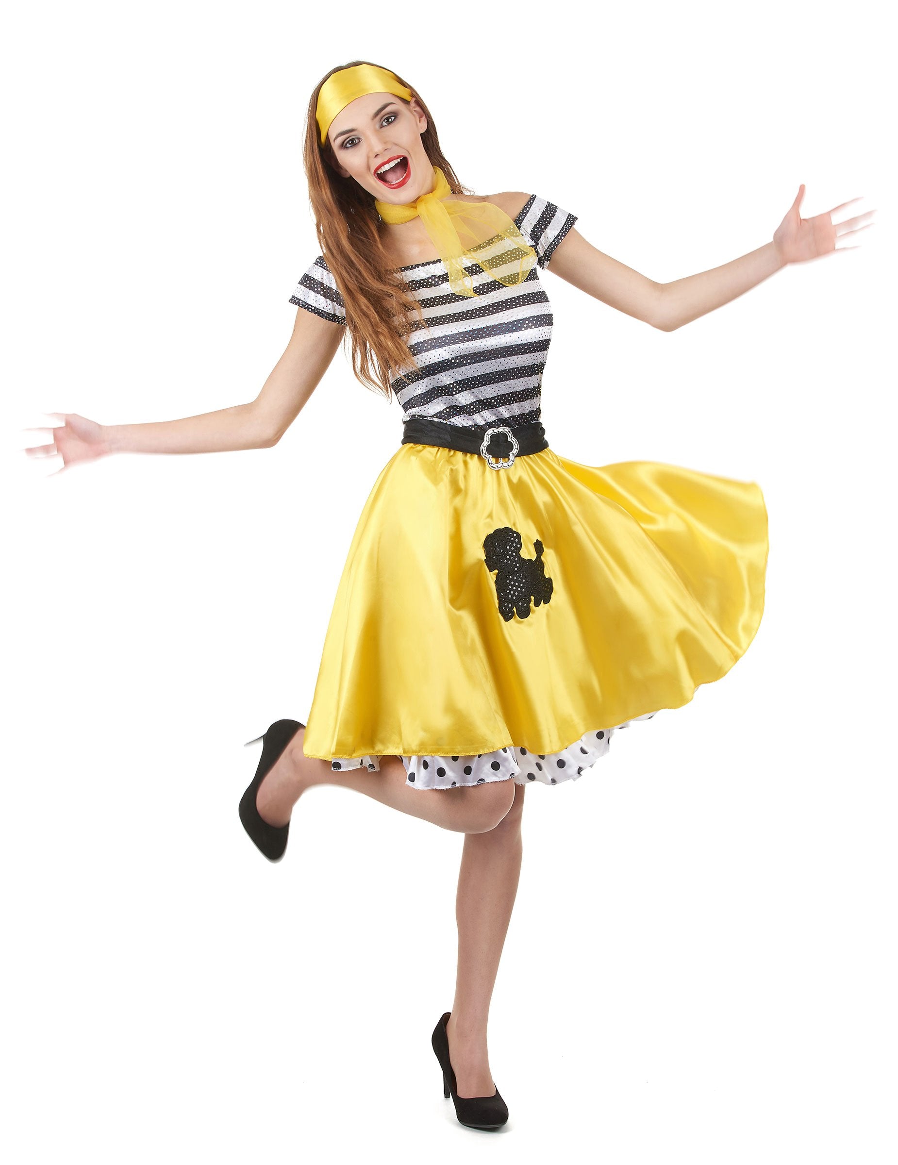 Acest costum pentru adulți întruchipează anii 50. Include un tricou, fustă, eșarfă și bandă de cap (șosete și încălțăminte nu sunt incluse). Tricoul are dungi orizontale alb-negru. Cu mâneci scurte este acoperit cu paiete multicolore. Partea din spate este dungi simple, fără strălucire. Decolteul și mânecile sunt elastice. Fusta este galbenă din satin și o bandă albă cu puncte de polka neagră este fixată pe petticoat -ul inferior. Un câine cu strălucire este cusut pe petticoat. Mărimea este elastică. O centură neagră face posibilă alăturarea celor două elemente. O buclă de plastic argintiu împodobește țesătura. Eșarfa în văl galben fin măsoară 22 x 85 cm. Banda de cap este galben satinat. Măsoară 12 x 96 cm. Luminează camera cu această deghizare dacă mergi la o temă retro seara.