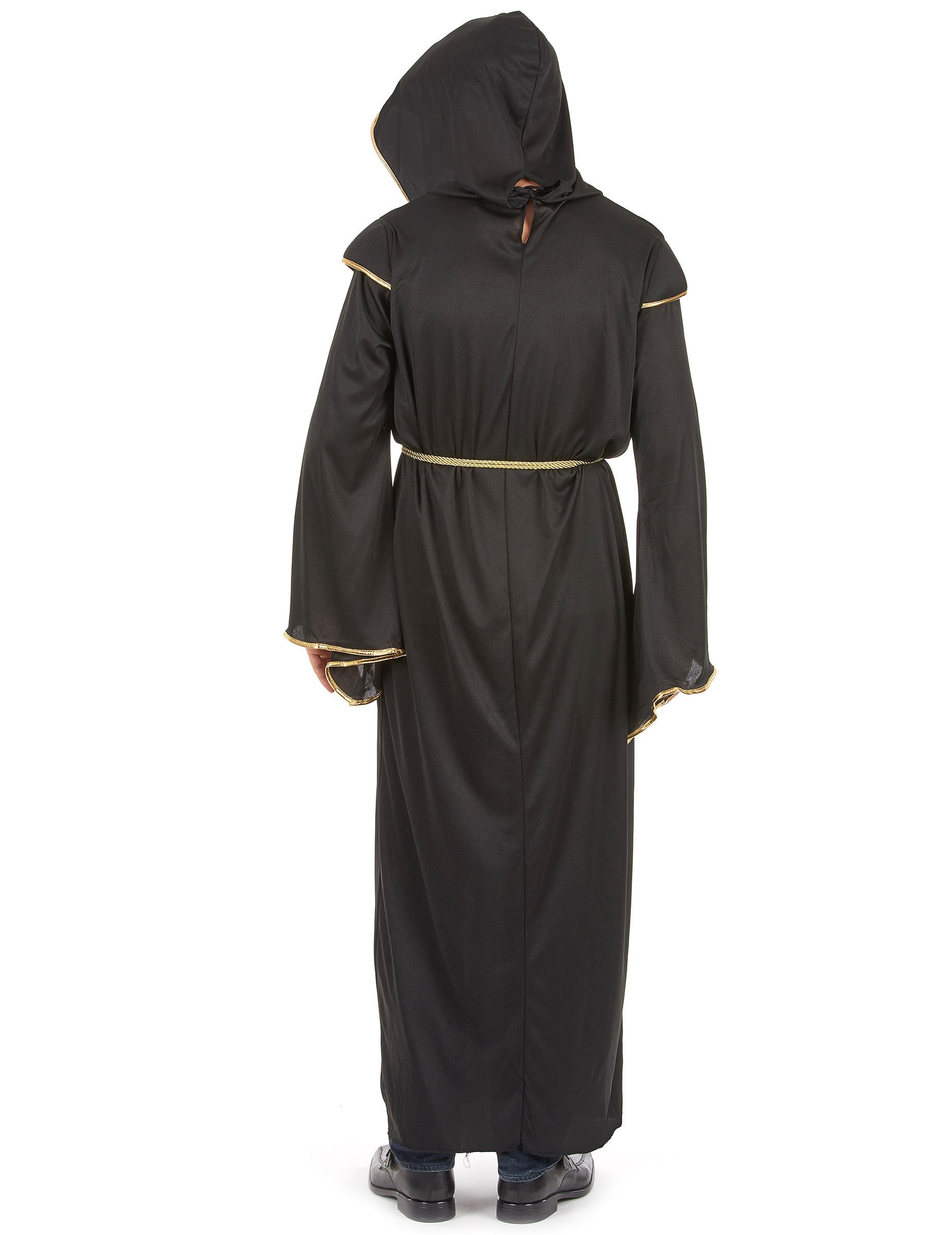 Acest costum pentru adulți este reprezentarea unui călugăr. Include o rochie și o centură (pantaloni, carte și încălțăminte nu sunt incluse). Rochia lungă este în poliester negru fin. O glugă neagră este cusută și o dantelă vă permite să închideți gulerul de pe gât. Finisajele de cusătură sunt aurii. O cruce de aur este tipărită pe piept. Centura de aur reprezintă o frânghie simplă. Vrei să fii original în timpul unui costum sau o seară tematică, această deghizare ascetică vi se va potrivi.