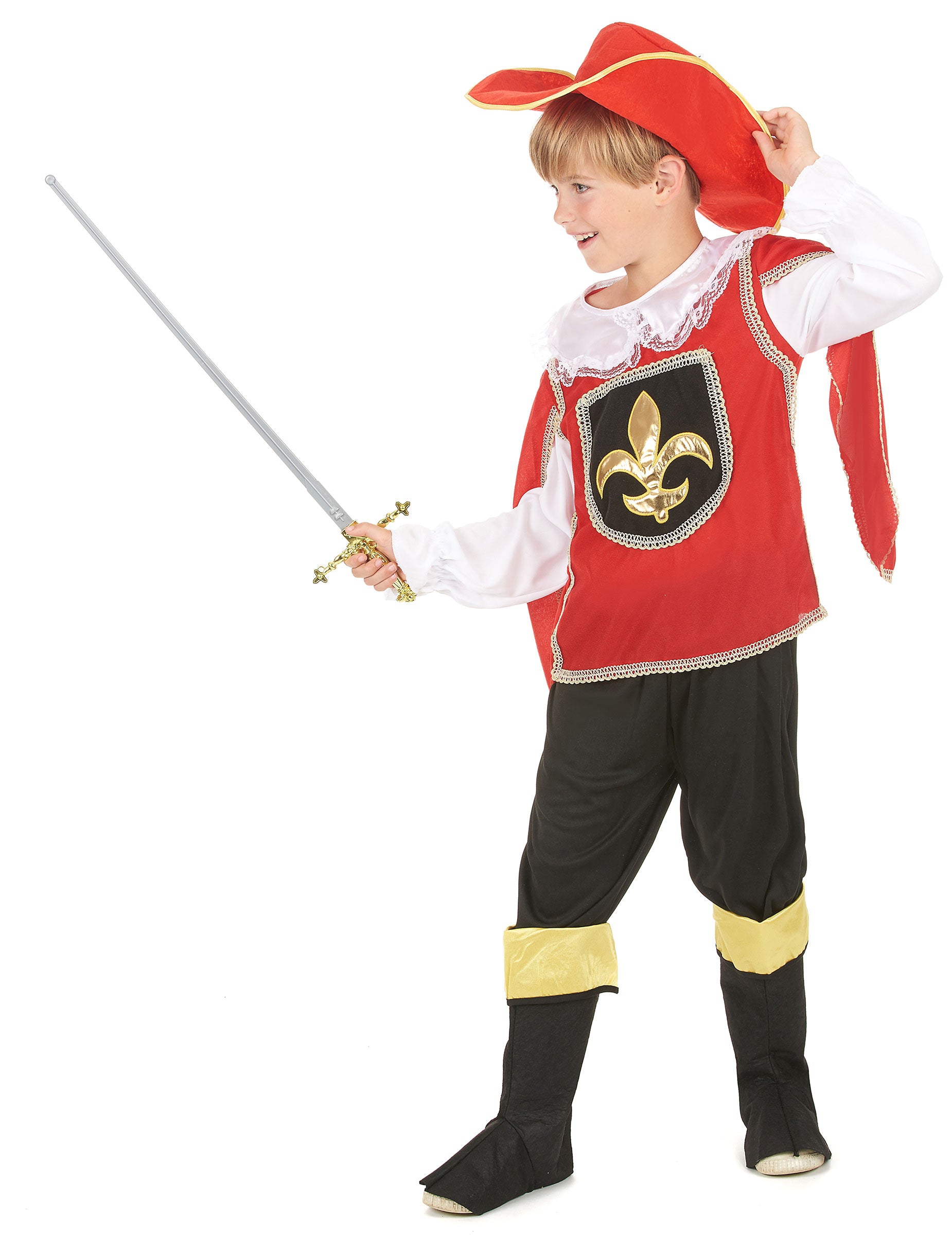 Acest costum al copiilor reprezintă un muschetă. Include o cămașă, un Pantacourt, o pălărie și o exces de corpuri (sabia și pantofii nu sunt incluse). Cămașa are mâneci albe și un guler cu efect din dantelă. Plastronul Roșu are melodii Cape în mâneci. Finisajele sunt aurii și o insignă neagră evidențiază un Fleur Golden -de -Lis pe piept. Pantacourtul negru este din poliester. Cizmele cu pâslă neagră o păstrează. O bandă de aur este amplasată în partea de sus a Sur-Boots. Se închid pe pantofi folosind zgârieturi. Pălăria este roșie cu un efect simțit. Firele de aur sunt cusute pe margine. Turul principal este de aproximativ 48 cm. Acest costum va fi perfect pentru a -ți deghiza băiețelul cu ocazia unei petreceri tematice sau a carnavalului.