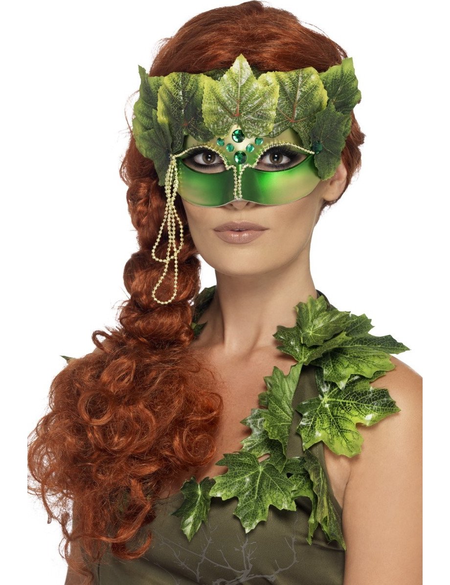 Această mască verde și aurii de nimfă este din plastic. Este frumos decorat cu perle spumante din plastic verde. Perlele de aur vin să împodobească conturul ochiului și nasului și cad ușor pe partea dreaptă. O farandol de frunze împodobește vârful măștii. O panglică neagră așezată pe spate vă permite să o atașați în funcție de dimensiunea capului. Această mască de nimfă va fi perfectă pentru accesorizarea unei deghizări în timpul unei seri tematice sau a unui carnaval.