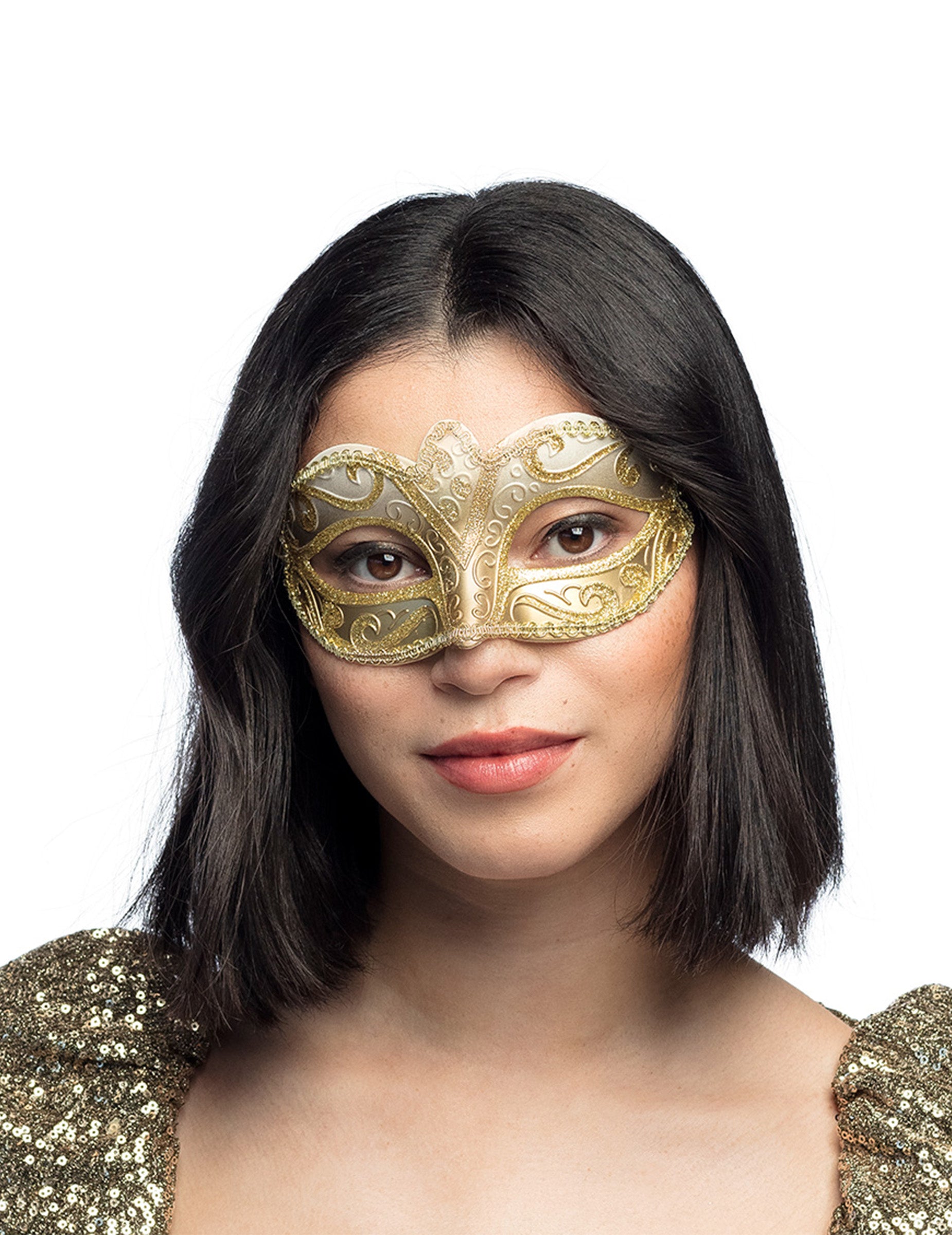 Acest lup venețian pentru adulți este din plastic dur. Pe un fundal alb, un gradient de aur și sclipici arabesques scânteie această mască. Cusăturile de aur își marchează conturul. Două panglici galbene permit să se formeze acest lup în spatele capului. Purtați acest lup pentru a vă evidenția în costumul dvs. pentru Carnavalul de la Veneția sau o seară deghizată pe această temă.
