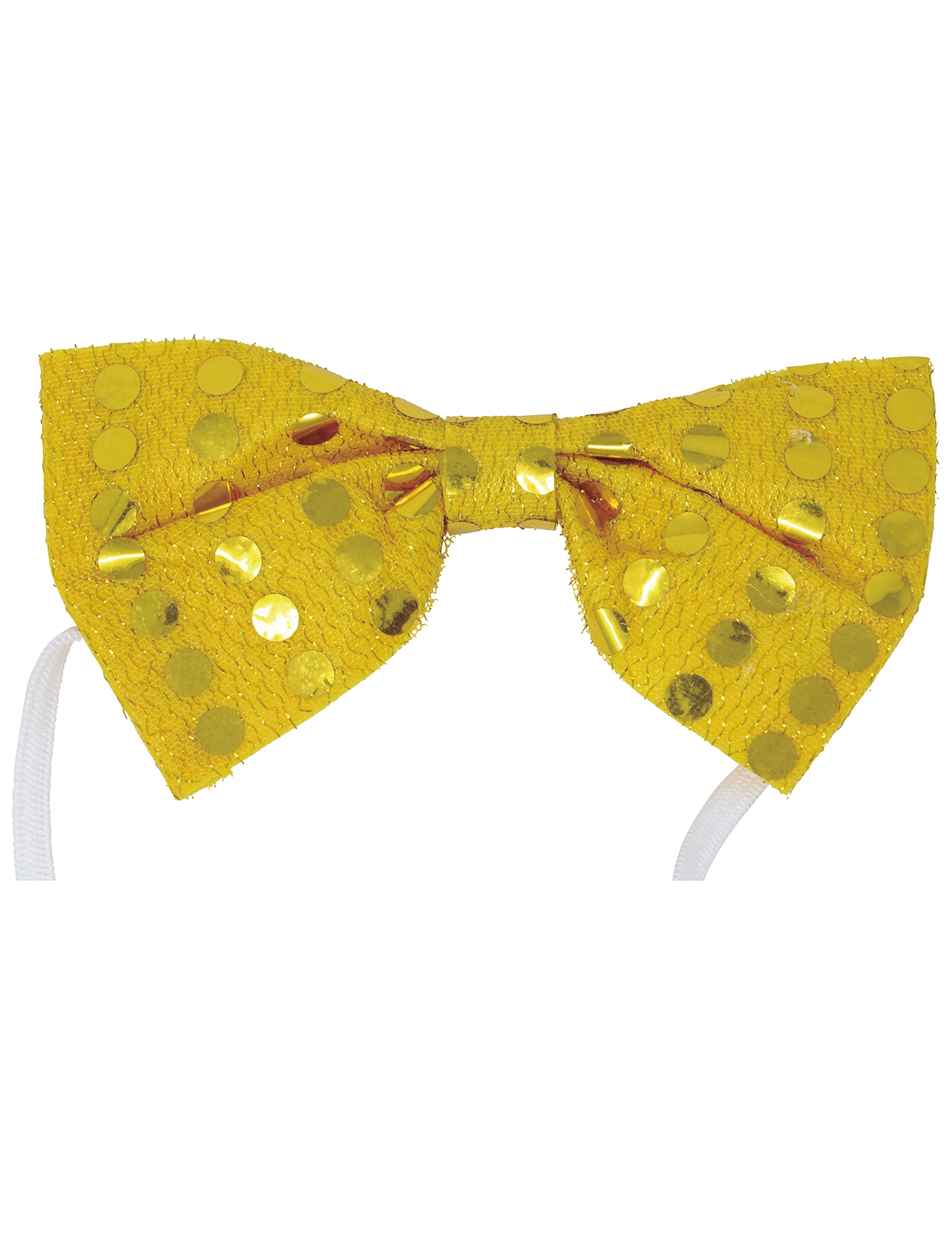Acest nod de fluture adult este din țesut auriu. Este decorat cu sclipici de aur. Acesta din urmă măsoară aproximativ 14 x 8 cm și este menținut în jurul loviturii datorită unui elastic. Acest nod de fluture de aur va fi perfect pentru a completa un costum pe tema Cabaret cu clasă.