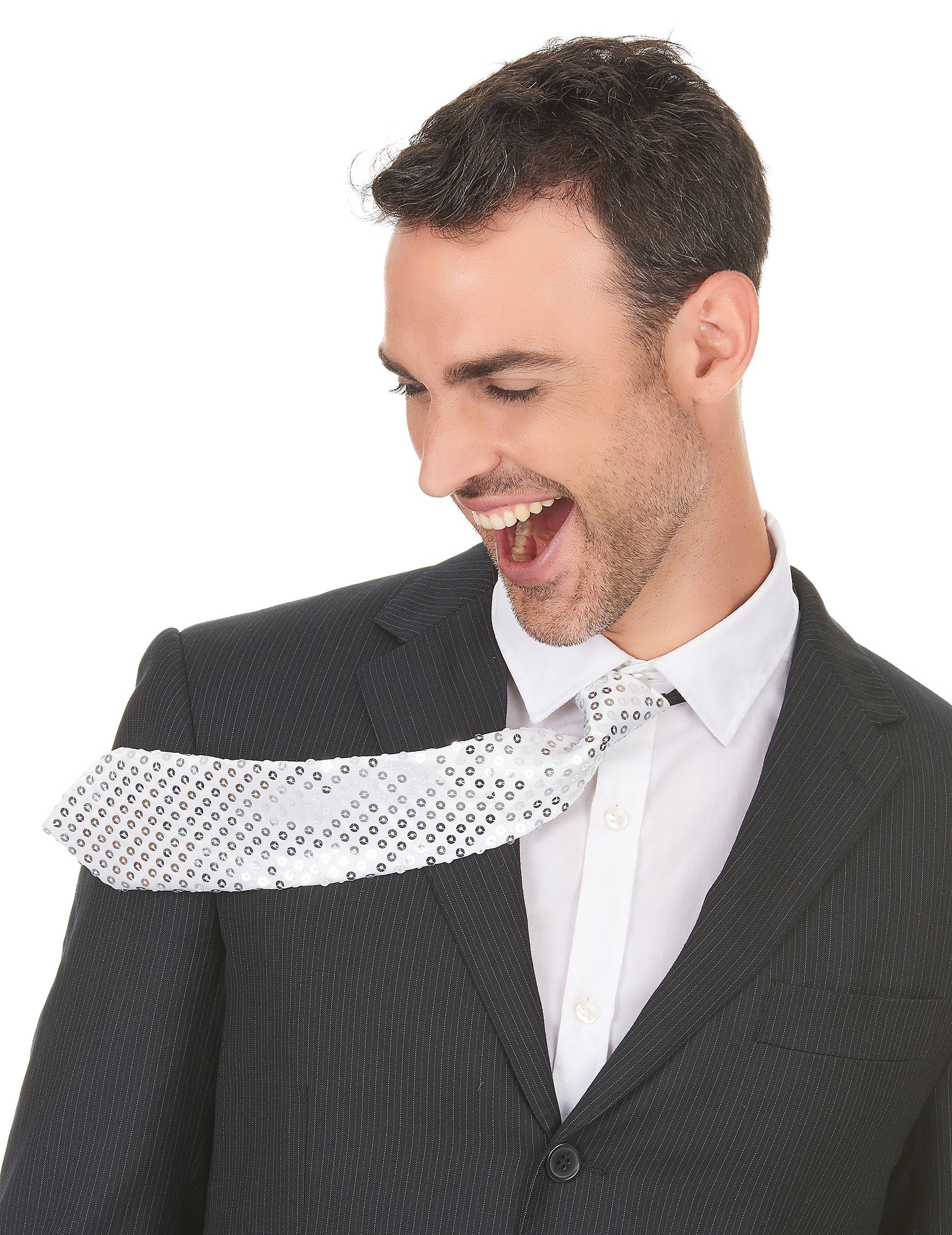 Ea măsoară 38 cm Aproximativ, nodul inclus. Materialul este alb-argintiu. paiete argintii și briliantele sunt cusute pe toată cravata, în față și în spate.