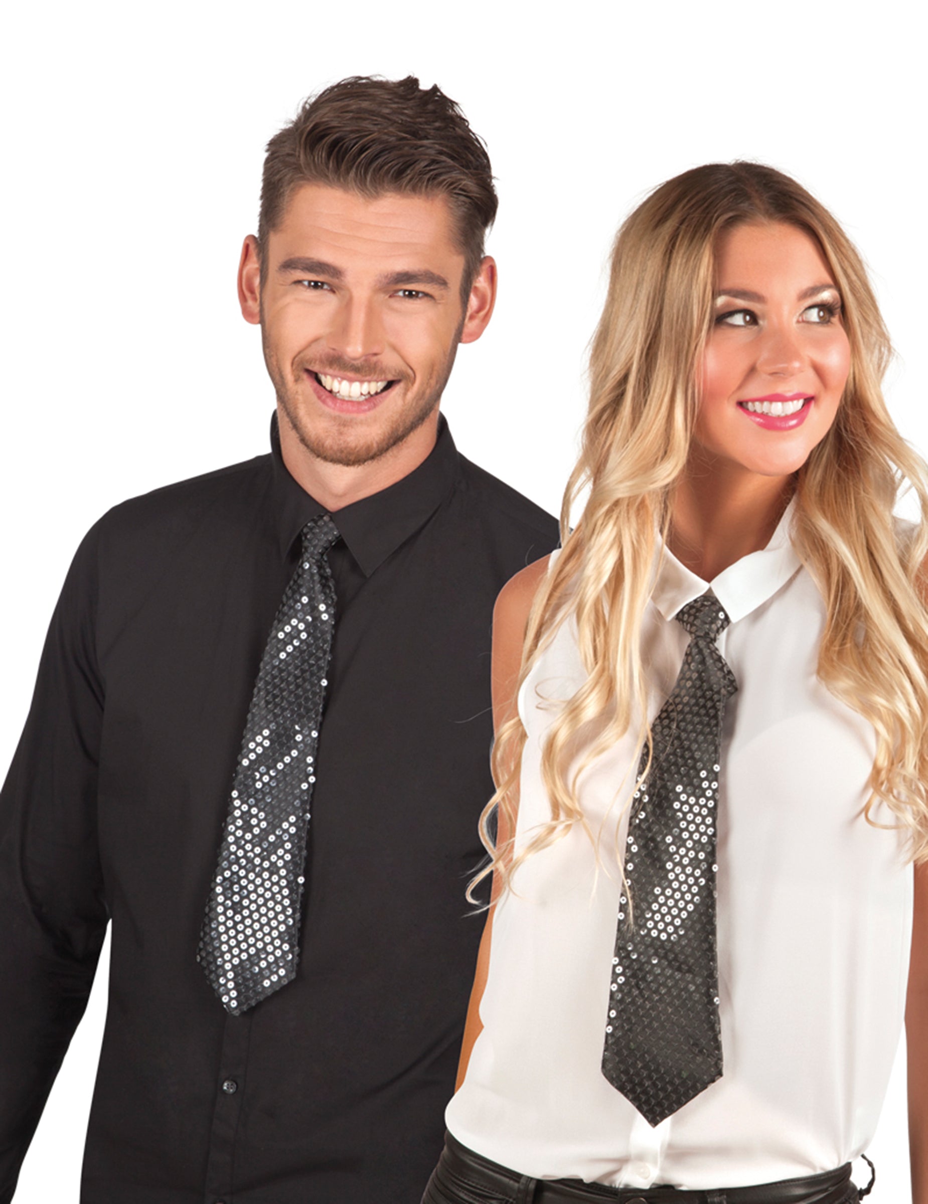 Această cravată pentru adulți este făcută din poliester. Măsoară 39 cm de la nod la vârf. Țesătura neagră este acoperită cu paiete transparente cusute cu un efect strălucitor. Această cravată este purtată pe gât datorită unui elastic negru. Introduceți discoteca sau costumul clasic cu această cravată sclipitoare în timpul unei seri deghizate.