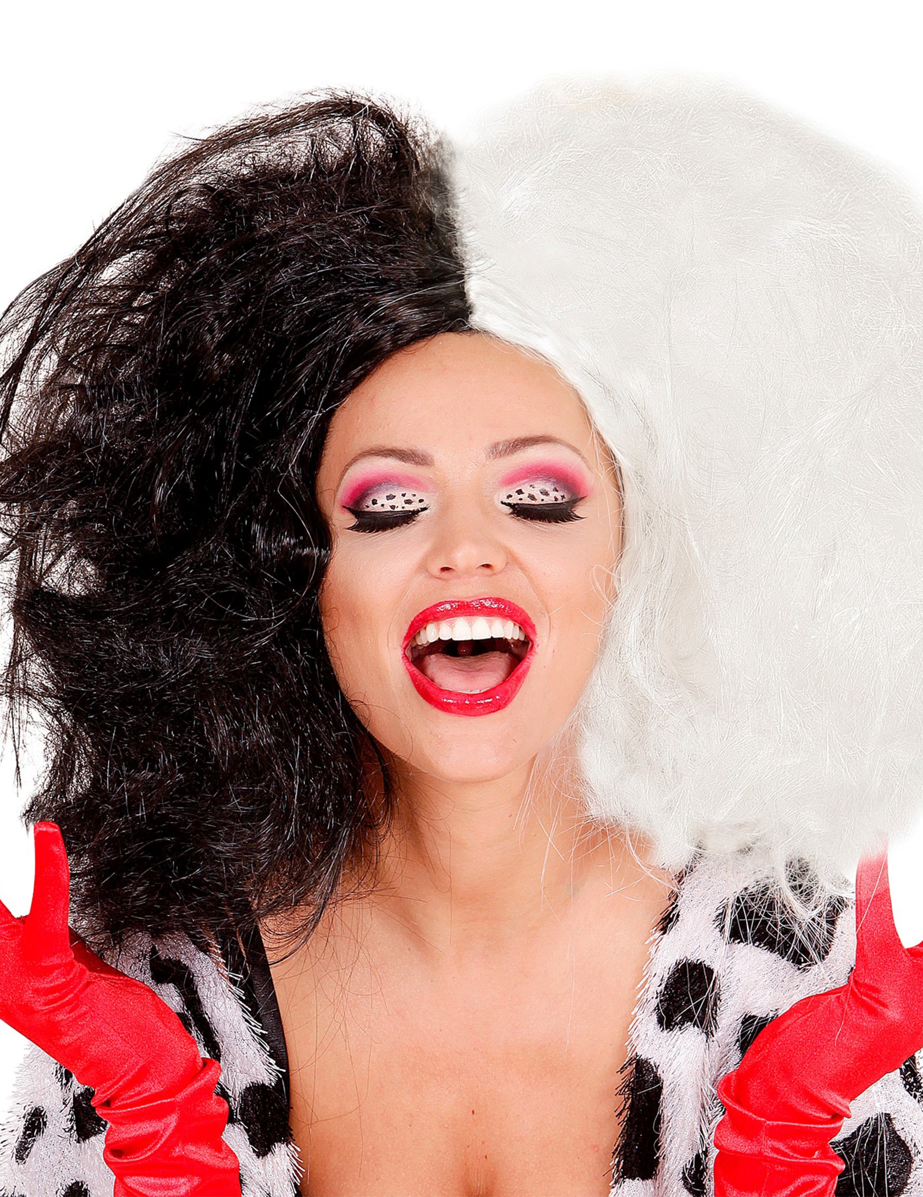 Această perucă lungă alb -negru pentru femei poate fi purtată în două moduri: puteți lăsa părul îndreptat, fie Crêper și să -l rezolvați cu lac pentru un efect mult mai crud. Pe o rochie sobră sau pentru costumul unei femei crude, devine diavolul serilor voastre deghizate. Copyright Widmann Srl