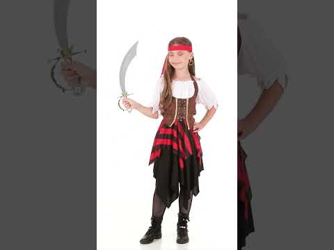 Acest costum pirat pentru fete este format dintr -o rochie, un corset și o bandă de cap (sabie, colanți și încălțăminte care nu sunt incluse). Partea de sus a rochiei este alb, cu un decolteu drept elastic. De asemenea, are mâneci scurte tăiate în puncte. Partea de jos a rochiei este neagră, cu o petticoat cu dungi negre și roșii peste ea. Pentru un plus de confort, talia rochiei este elastică. Corsetul este purtat ca un spate fără spate. Este negru și elastic pe spate și efectul pielii maro pe față. Are o dantelă neagră reglabilă în fața centrală. O bandă roșie închisă se va lega cu ușurință în jurul capului. Acest costum pirat va fi perfect pentru a deveni căpitan în timpul unei petreceri de îmbrăcăminte fanteziste precum Carnavalul.