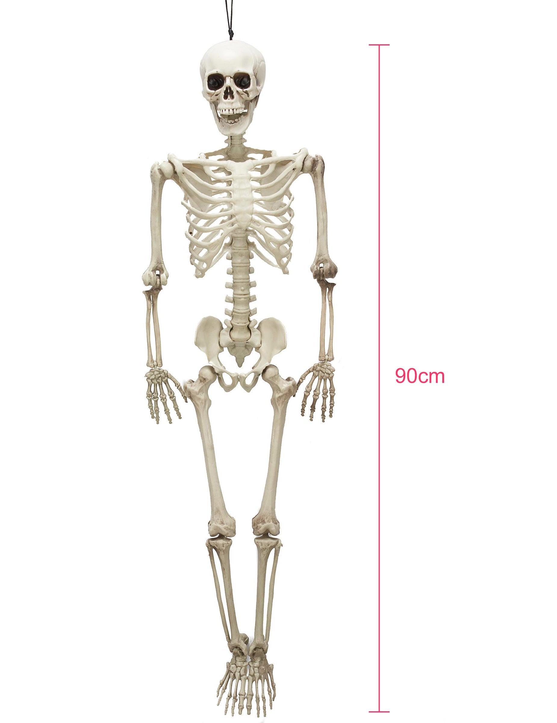 Acest schelet atârnat este din plastic. Măsoară aproximativ 90 cm înălțime. Membrii scheletului sunt articulate, astfel încât să -l puteți modula la comoditatea dvs. O legătură este prezentă pe craniul scheletului pentru a -l suspenda cu ușurință. Această decorare a scheletului va fi perfectă pentru completarea decorației camerei dvs. cu ocazia Halloween -ului.