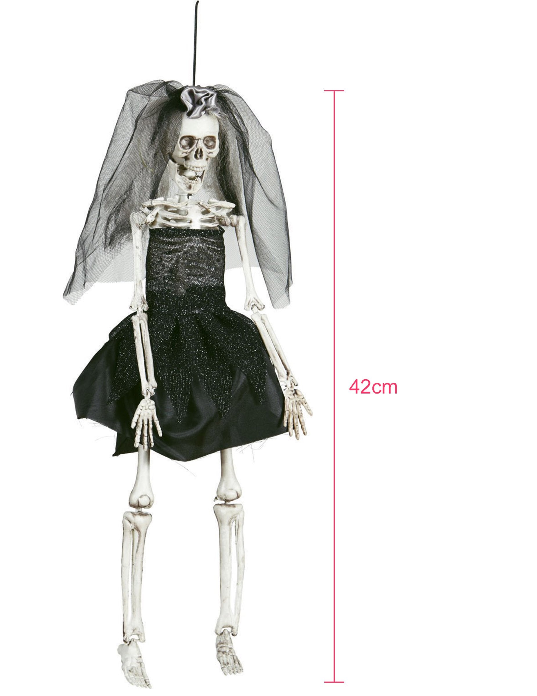 Acest decor este în imaginea unei mirese de schelet negru. Măsoară aproximativ 42 cm și va fi ușor atașat datorită unui șir fixat pe craniu. Toate îmbinările sunt articulate. Rochia și voalul sunt în tul și în țesătură din satin negru. Acest decor va fi perfect pentru o temă de groază în timpul unei seri de Halloween, de exemplu. Copyright Widmann Srl