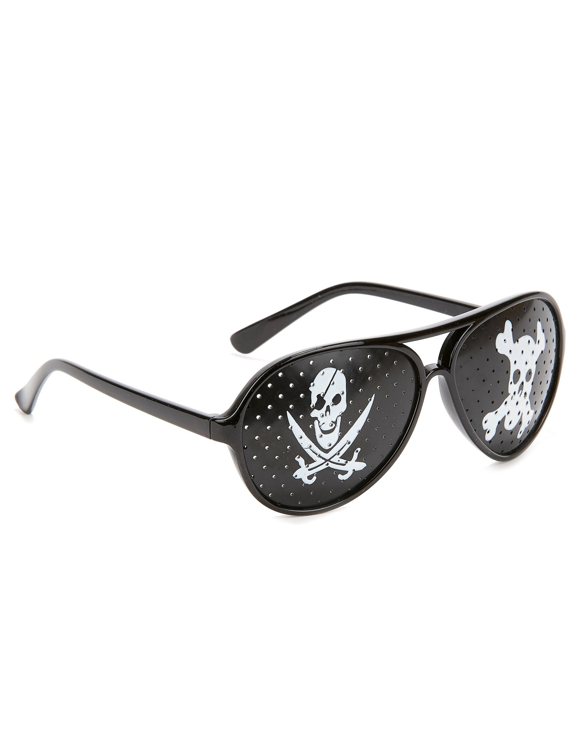 Aceste ochelari de pirați negri pentru adulți sunt din plastic. Ochelarii sunt confecționate din plastic negru opac. Sunt tipărite cu cranii albe. Găuri mici sunt prezente pe ochelari, astfel încât să puteți vedea. Aceste ochelari vor fi perfecte pentru a -ți instala deghizarea piratului cu originalitate.