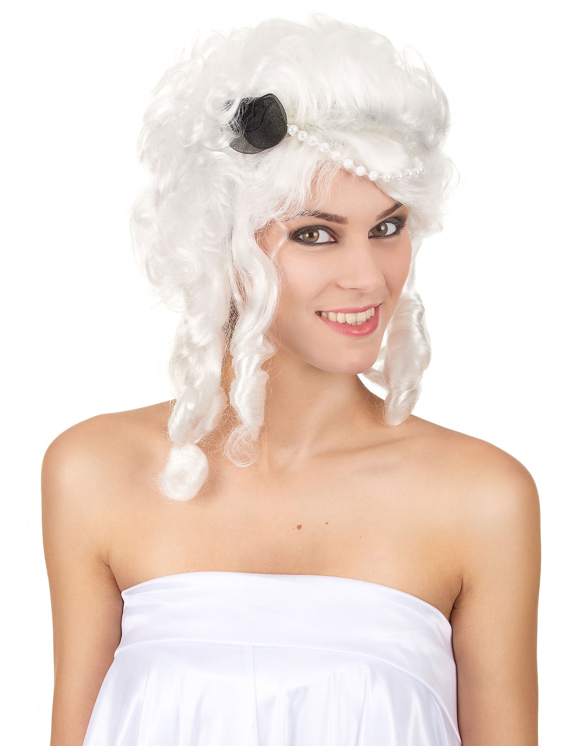 Această perucă de renaștere este destinată femeilor. Este format din părul sintetic alb. Acestea sunt mai scurte pe partea de sus și înapoi pentru un efect mare. Englezii lungi sunt prezenți pe părțile laterale și pe gât. O franjuri pe lateral decorează această perucă și acoperă fruntea. În cele din urmă, perlele albe și un roz din țesătură neagră decorează peruca. Acest accesoriu va fi perfect pentru completarea costumelor dvs. în serile dvs. pe tema Renașterii.