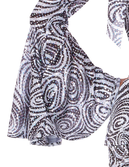 Această deghizare a discotecii pentru femei este formată dintr -un top, pantaloni și bandă de păr (nu sunt incluse pantofi). Partea de sus este alb, iar zero modele negre sunt tipărite pe întreaga îmbrăcăminte. Perlele de paiete vin să aducă un efect genial ținutei. Mânecile sunt lungi și evazate în coate. Pantalonii potriviți sunt elastici la talie pentru mai mult confort. Este evazat la picioare și se desparte de genunchi pentru un efect pufos. În cele din urmă, o bandă de cap pe care o poți înnoda cu ușurință în jurul capului tău vine să aducă ultima atingere la ținută. Acest costum genial va fi perfect pentru a vă transforma într -o adevărată regină a dansului în timpul serilor voastre pe tema disco.