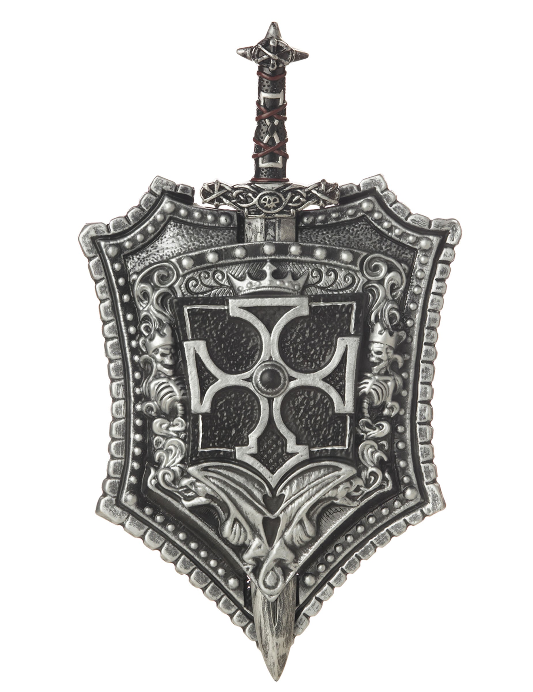 Acest lot este format dintr -o sabie și un cavaler pentru adulți. Scutul din plastic este negru cu reflecții argintii. Măsoară aproximativ 45 x 35 cm și este păstrat pe braț folosind o zgârietură. Sabia din plastic are o lungime de aproximativ 60 cm. Are o lamă gri și neagră. Retrăiește -ți timpul cruciadelor din momentul unei seri deghizate pe tema cavalerilor.