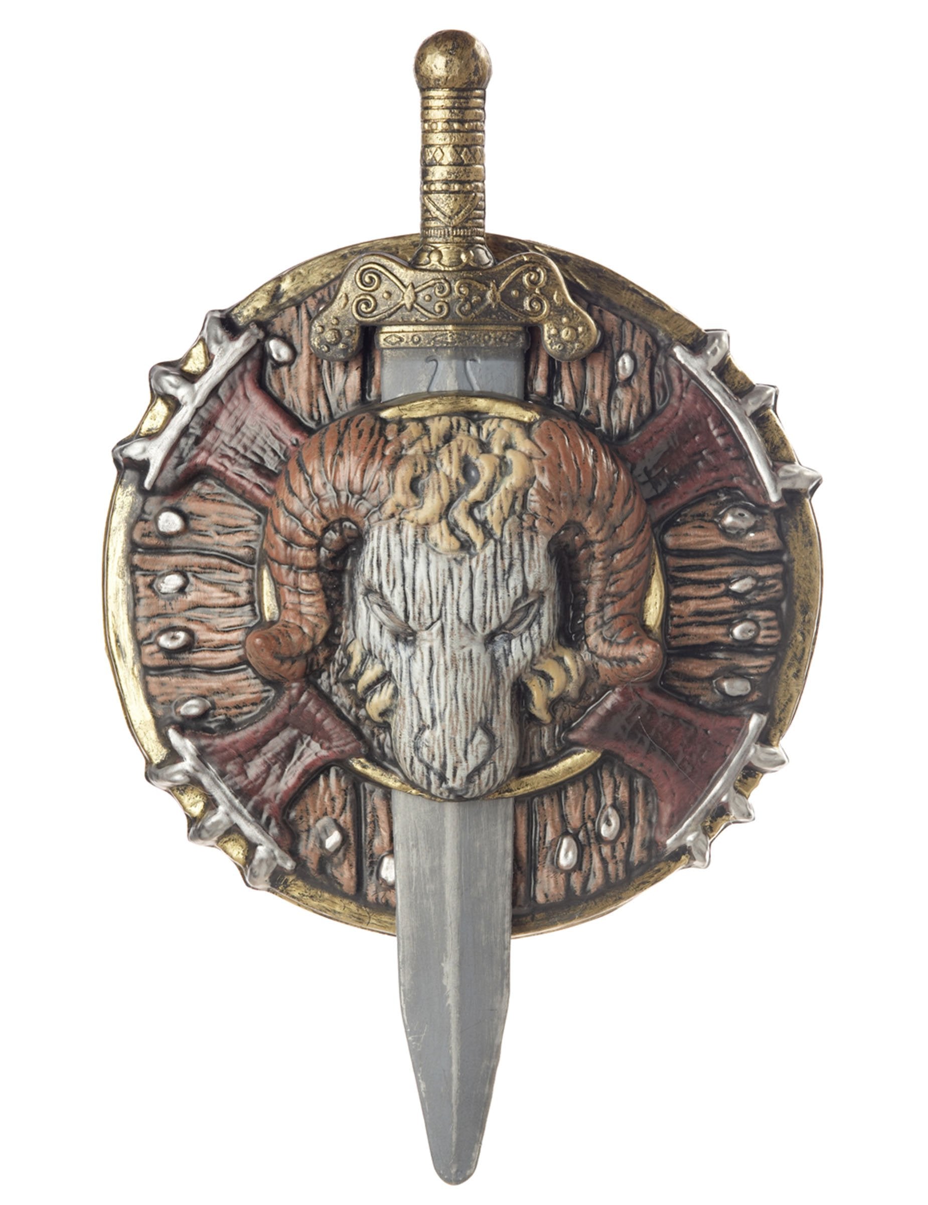 Acest set include o sabie și un scut din plastic. Sabia are mânerul de aur și lama mare de argint. Scutul are diametrul de 30,5 cm. Imită lemnul, granițele sunt aurii și este reprezentat un berbec în centru. Joacă barbari pentru următoarea seară tematică și completează -ți costumul cu aceste accesorii realiste!