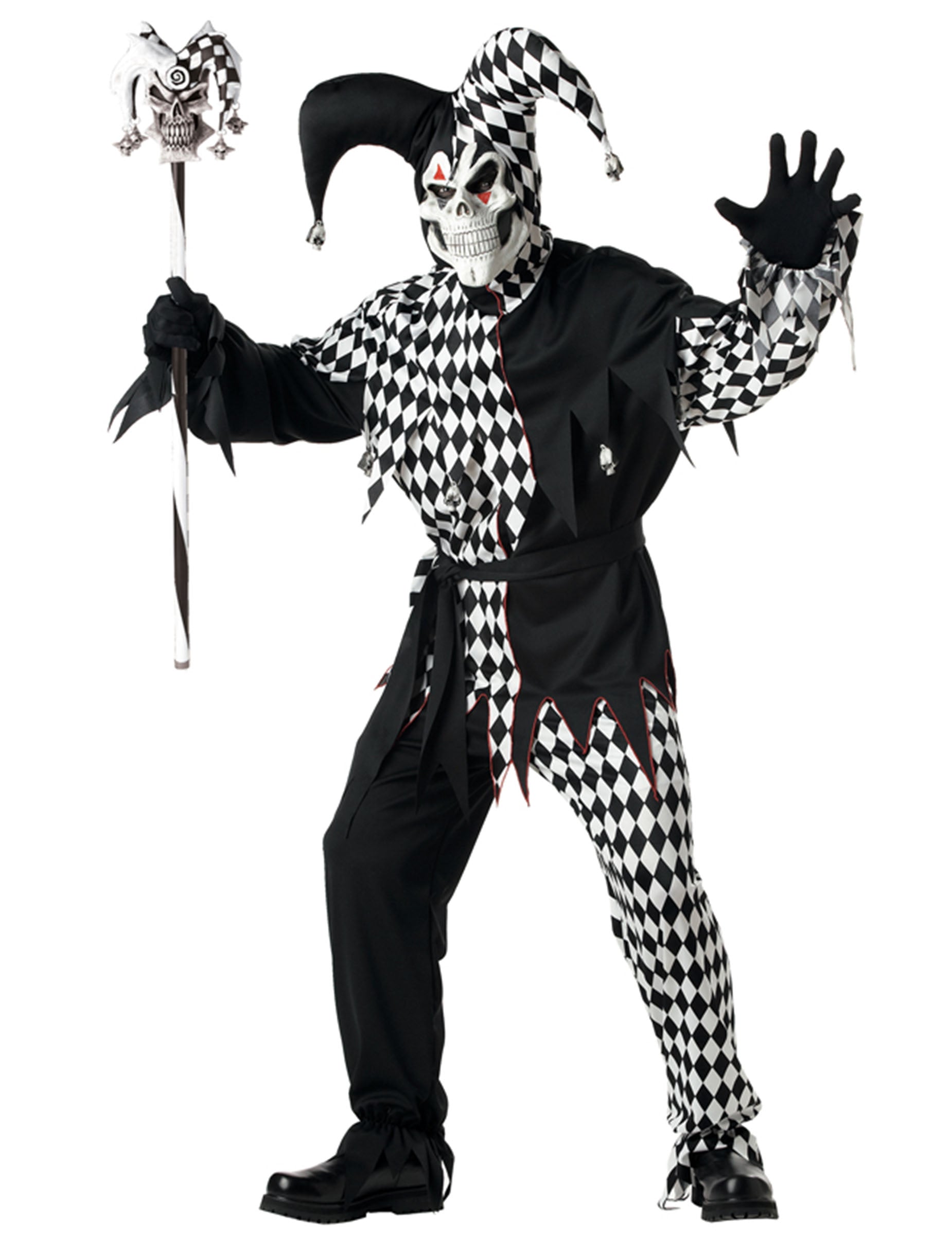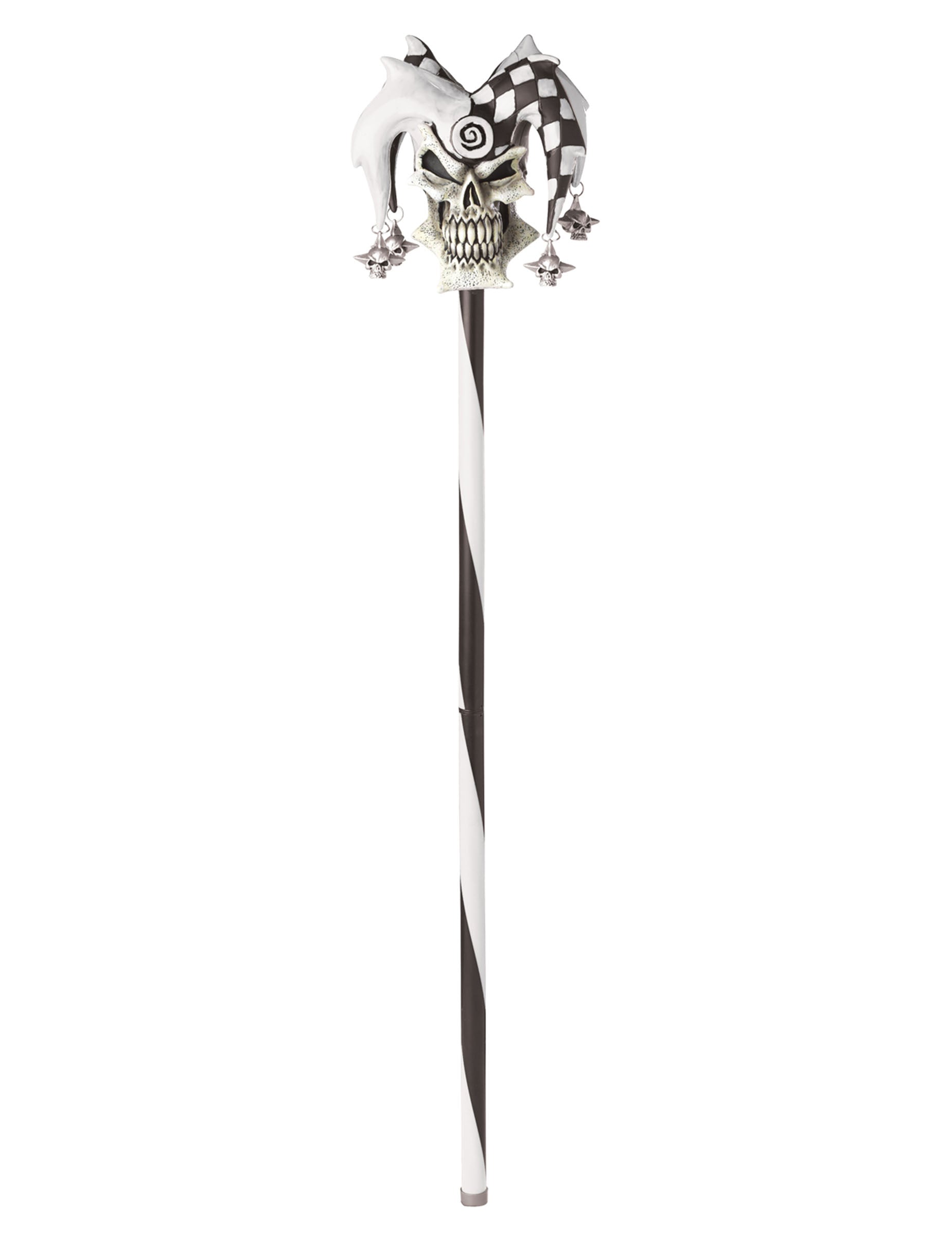 Acest baston de bufon măsoară aproximativ 101,6 cm. Mânerul este acoperit de o bandă albă și o bandă neagră care s -a înfășurat în jurul ei. Partea de sus a trestiei este un craniu cu o pălărie jubilantă, jumătate alb, jumătate cu cețări cu burtă în formă de moarte a morții, de asemenea, terminată cu vârfuri. Bania este în două părți. Ideal pentru Halloween, acest baston va începe toți vecinii.