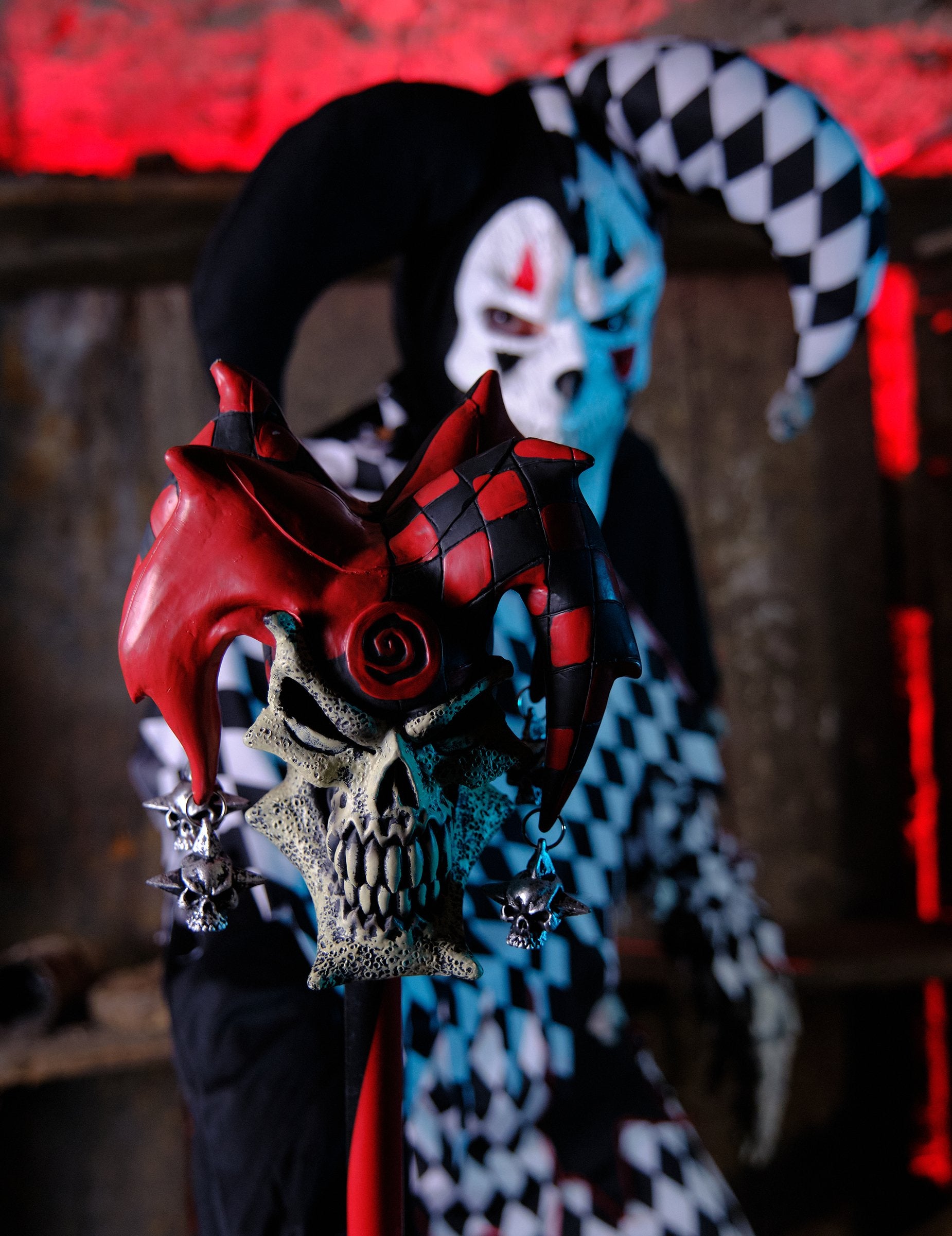 Această tijă de bufon este roșie și neagră. Are 101,6 cm înălțime. Craniul din vârful trestiei poartă pălării negre și roșii cu jumătate de peste jumătate. La capătul trapelor pălăriei sunt clopote de craniu înconjurate de vârfuri. Bania este roșie și neagră. Completați -vă costumul mortal de bufoon mort pentru Halloween cu acest baston.