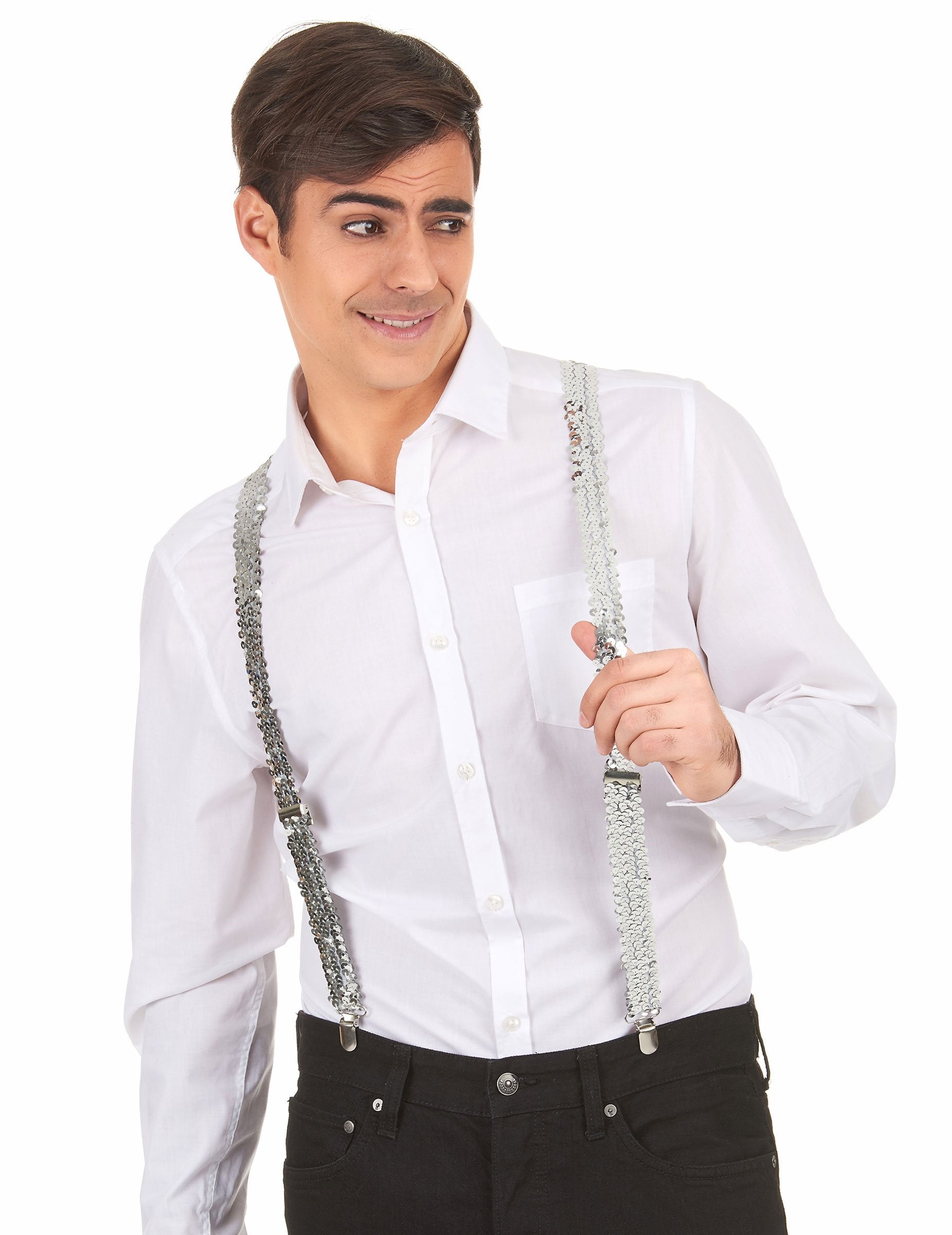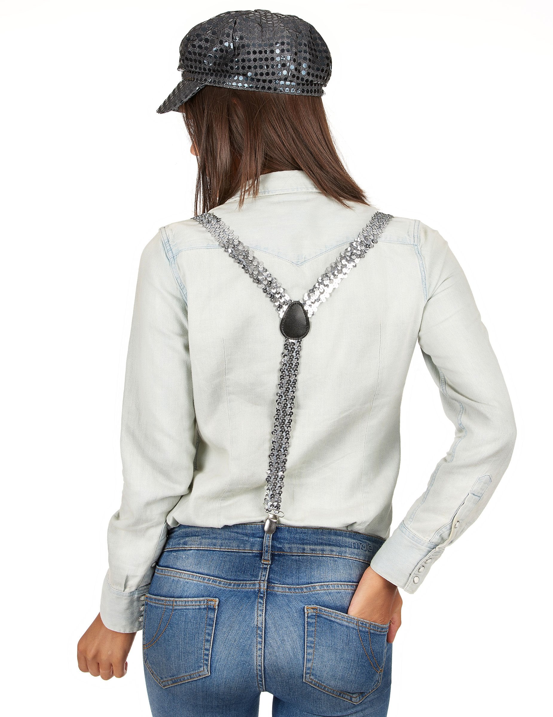Aceste bretele cu paiete argintii Curelele pentru adulți sunt reglabile în față. Închizătorii sunt metalici.