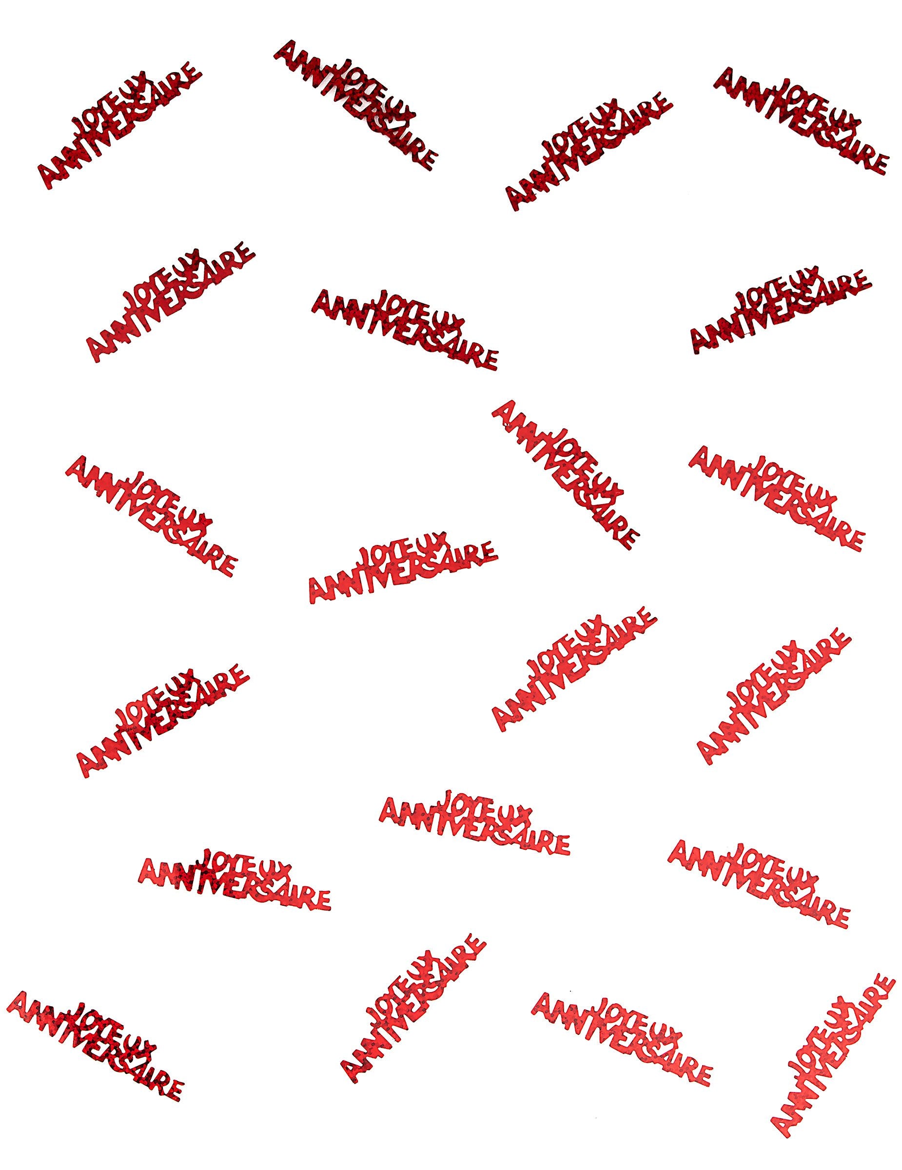 Acest lot este format din aproximativ 80 de confetti în hârtie din fibră de trestie roșie. Măsoară aproximativ 5,5 x 1,5 cm. Ele reprezintă mesajul „La mulți ani”. Aceste confetti vor fi perfecte pentru a vă decora masa de naștere.