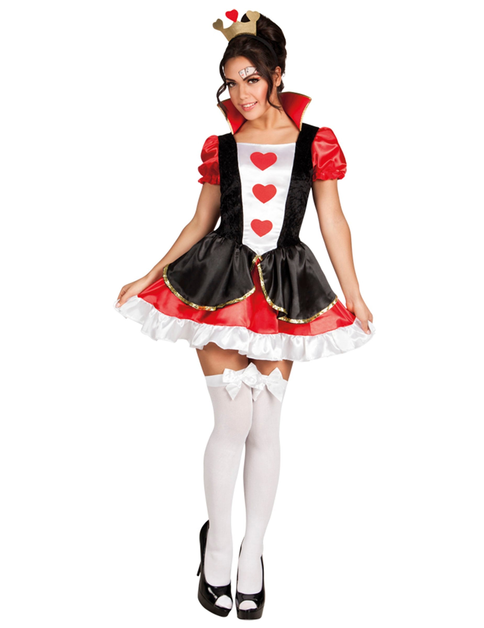 Costumul acestei regine pentru femei pentru femei este format dintr -o rochie și o bandă de cap (joasă și pantofi nu sunt incluși). Rochia este într -adevăr catifea roșie și neagră. Mânecile sunt scurte și pufoase. Partea de jos a rochiei este confecționată din țesătură din satin, iar la capete sunt prezente volane albe. Un guler mare de spumă roșie cu lianți aurii este cusut cu rochia. Trei inimi roșii sunt de asemenea tipărite în piept. Rochia este elastică și se va adapta perfect morfologiei tale. O bandă care depășește o coroană de aur cu o inimă roșie vine pentru a aduce ultima atingere acestei ținute. Acest costum va fi perfect pentru a întruchipa o regină a inimilor sexy cu ocazia carnavalului, de exemplu.