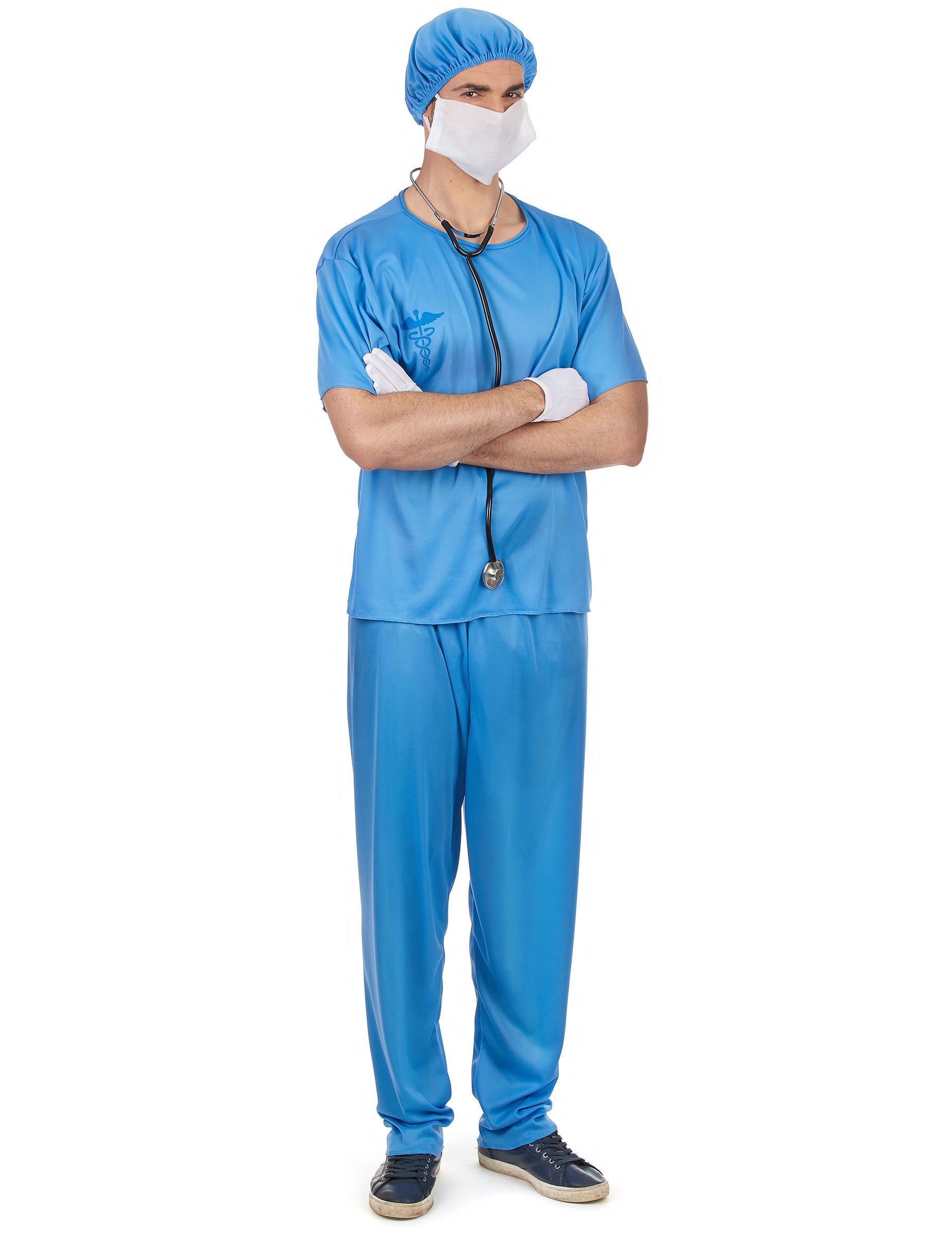 Costumul acestui chirurg este destinat bărbaților și este format dintr -un top, pantaloni, un charlotte și o mască (pantofi, stetoscop și mănuși care nu sunt incluse). Partea de sus și pantalonii sunt albaștri clare. Pe piept, este prezent simbolul caduceu. Este un albastru puțin mai închis. Pantalonii sunt la dimensiuni elastice, iar partea de sus este pur și simplu pusă ca un tricou. Charlotte va fi așezat pe cap datorită unui elastic. Albastrul său este același cu restul deghizării. În cele din urmă, masca este făcută din pâslă albă și va fi ținută în fața ta datorită benzilor elastice. Această deghizare foarte realistă va fi perfectă pentru a juca medici cu ocazia unei zile deghizate.
