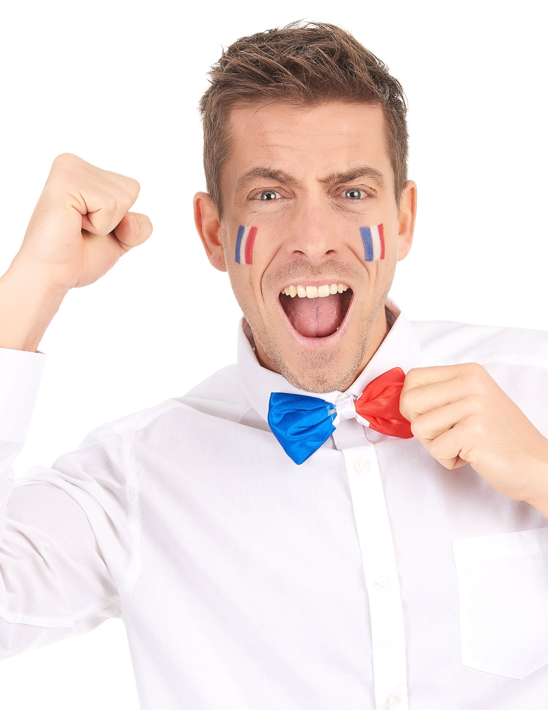 Acest papion tricolor afișează culorile Franței. Acesta va fi fixat direct în jurul gâtului de un elastic alb. Țesătura din care este compusă este cu aspect satinat. Aceste accesorii foarte elegante vor fi perfecte pentru euro sau pentru orice alt eveniment sportiv.