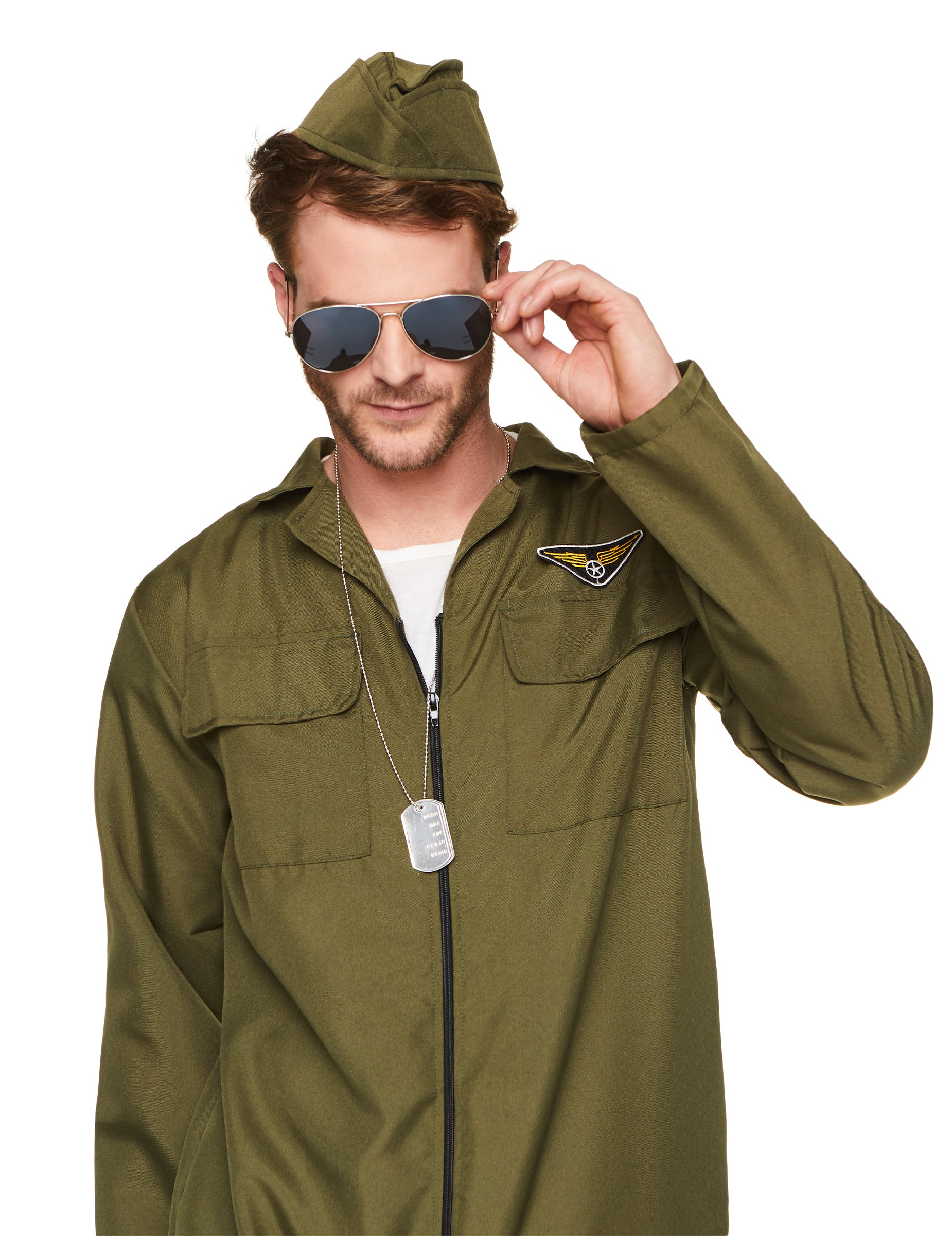 Acest costum de pilot de luptă pentru bărbați este alcătuit dintr -o combinație, o pălărie și o pereche de ochelari (pantofi și colier nu sunt incluse). Combinația Kaki Green are 2 buzunare în piept. Se închide pe față folosind un fermoar. Capul de aviator care se potrivește este Kaki Green. În cele din urmă, ochelarii completează acest costum. Are un cadru de metal argintiu cu ochelari de plastic negru pentru a imita ochelarii de soare. Acest costum va fi perfect pentru a deveni un adevărat pilot pentru o seară deghizată cu prietenii.