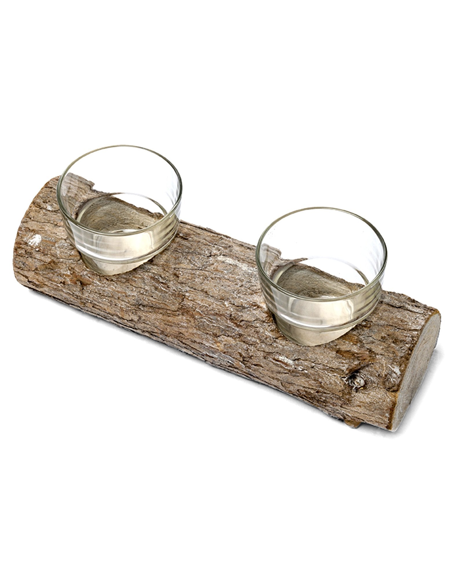 Acest magnific sfeşnic constă dintr-un mic buștean de lemn și doi suporturi de lumânări din sticlă.