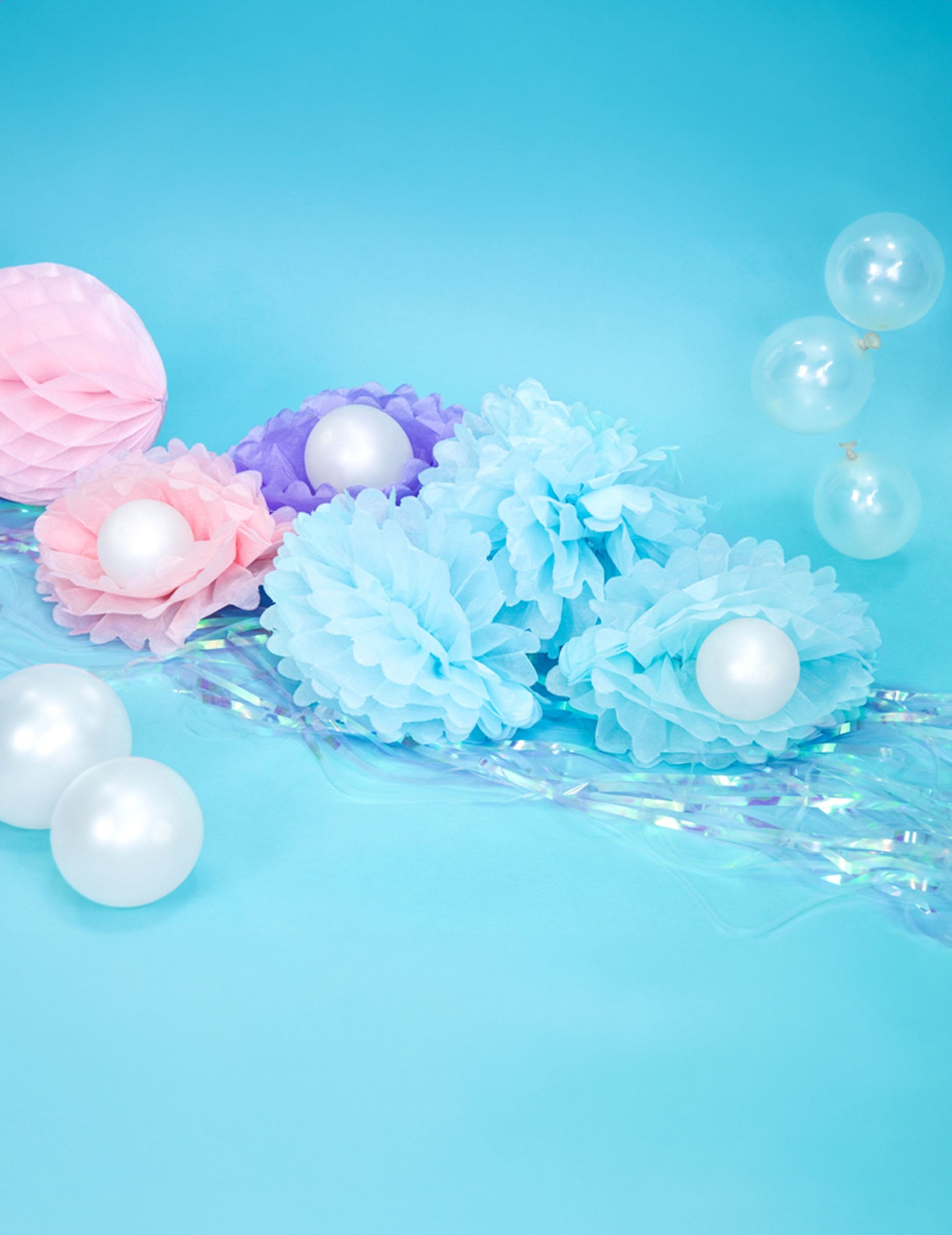 Acest decor este un pompom albastru. Măsoară 25 cm în diametru și cu un șir alb pentru a -l suspenda cu ușurință. Pentru a crea pompom, trebuie doar să desfășurați frunzele. Decorați -vă camera de la o zi de naștere sau un duș pentru copii cu acest pompom albastru!