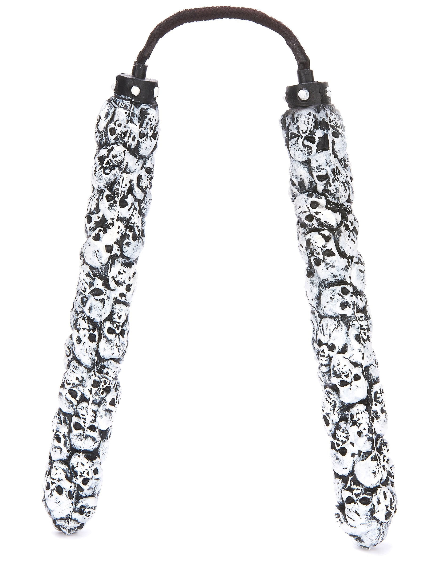 Aceste nunchaku de lux sunt pentru adulți. Ele măsoară 30 cm fiecare și sunt conectate între ele printr -o frânghie neagră. Fabricate din spumă poliuretanică, acestea sunt flexibile și, prin urmare, vor fi fără pericol. Sunt în relief, punctate cu cranii, cu tine se vor simți ca un adevărat shinobi. Acești Nunchaku vor fi perfecte pentru completarea unui costum ninja apocaliptic pentru carnaval sau pentru Halloween.