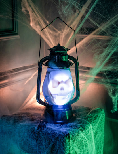 Această lampă de Halloween din plastic măsoară aproximativ 30 cm. Cu baza sa neagră și întărirea metalică pentru a o atârna, preia aspectul unei lămpi de ulei vechi. Micul ei în plus: se aprinde și dezvăluie un craniu înspăimântător care țipă cu 3 baterii AAA incluse! Pentru a fi plasat în intrarea dvs. sau pe bufetul de Halloween pentru o decorare a camerei cele mai terifiante!