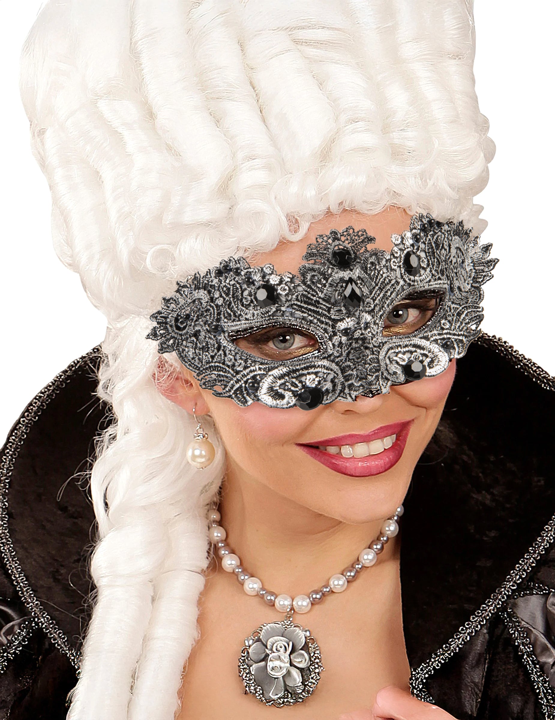 Această mască de carnaval este un lup din plastic rigid acoperit cu dantelă mare argintie. Este decorat cu pietre negre false. Are deschideri pentru ochi și legături în jurul capului cu legături din material. Acest lup venețian va fi perfect pentru a vă completa deghizarea de carnaval.