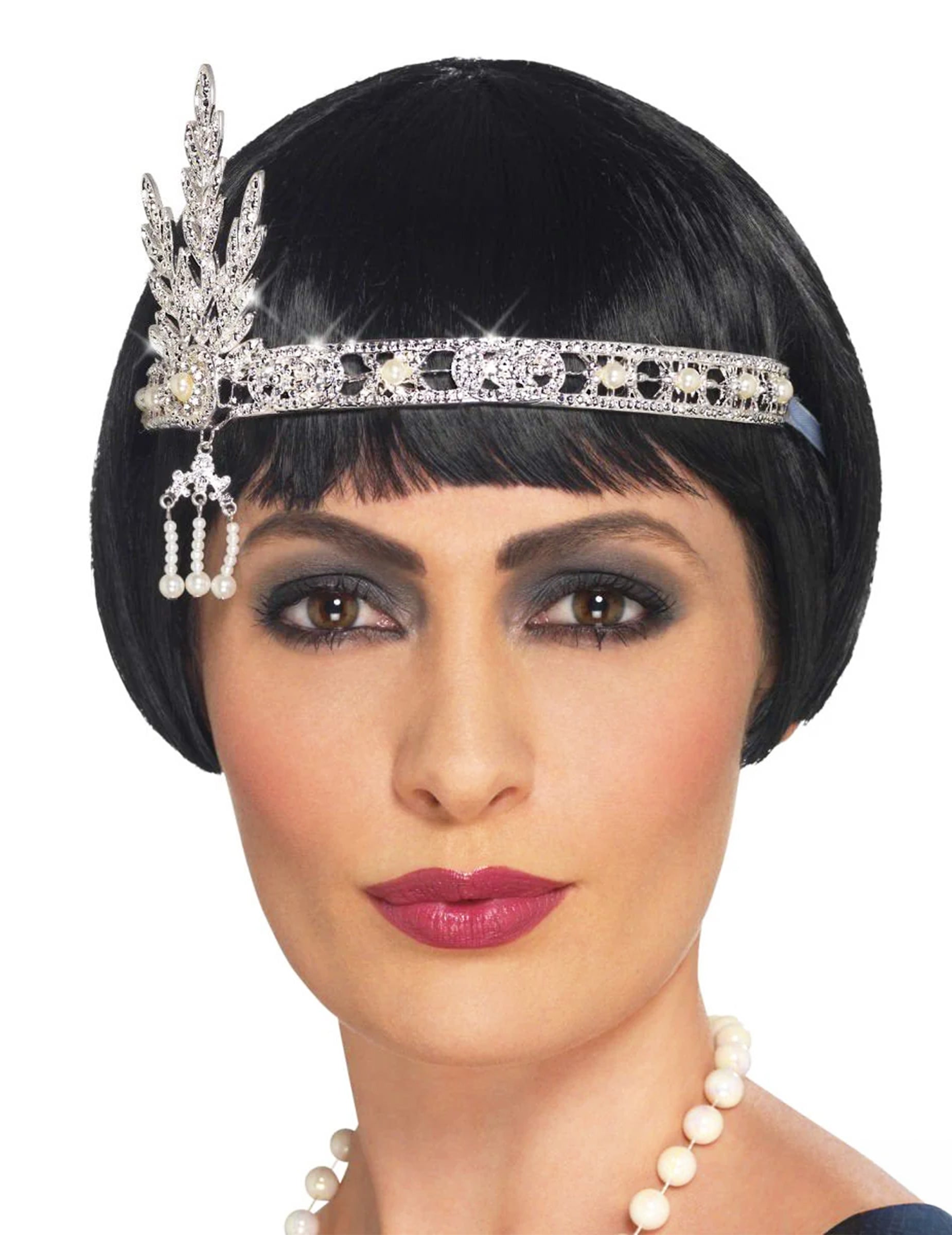 Acest banner Charleston pentru femei este din metal de argint. Este decorat cu mici perle din plastic perle. Pe partea laterală, reprezintă 3 ramuri. Acest banner este purtat folosind 2 legături pentru a nod în jurul capului. Acest banner va fi perfect pentru completarea deghizării retro cu ocazia unei seri pe tema anilor 20.