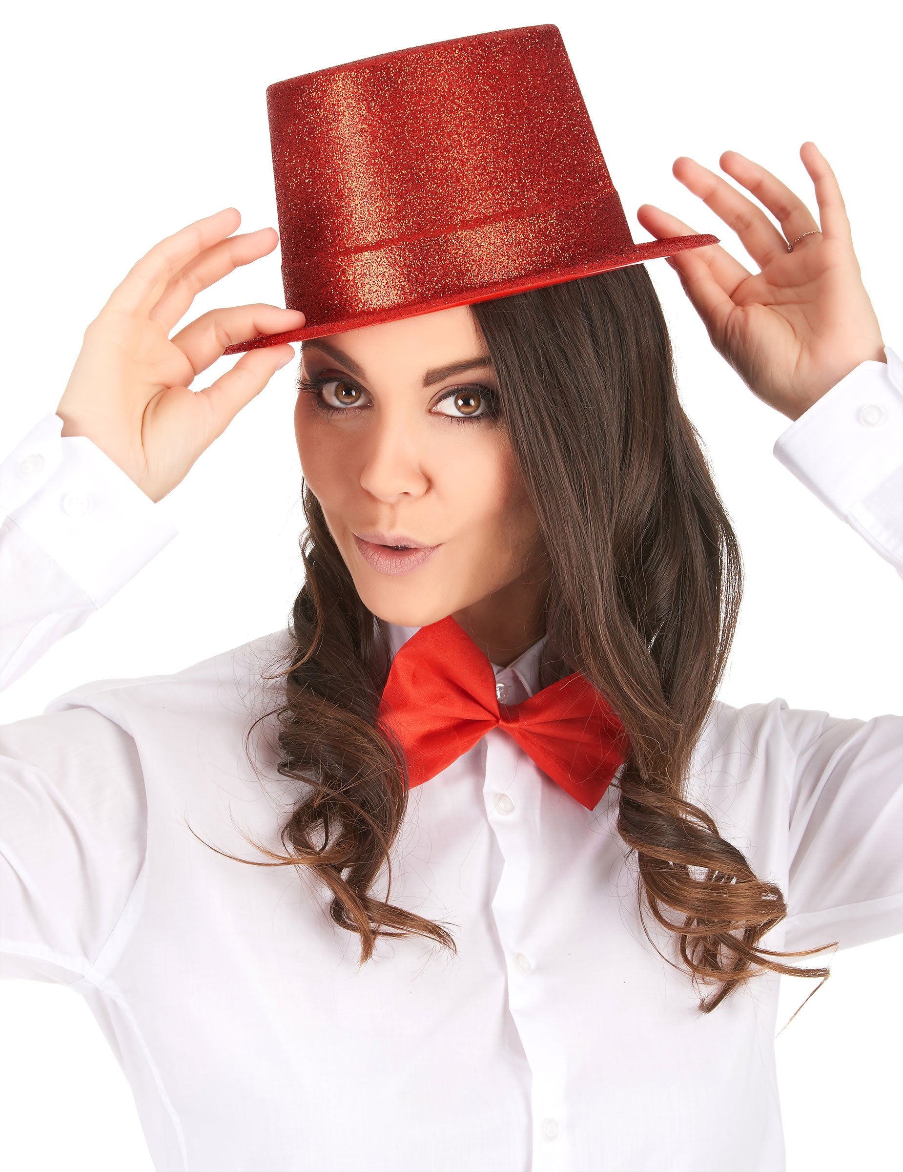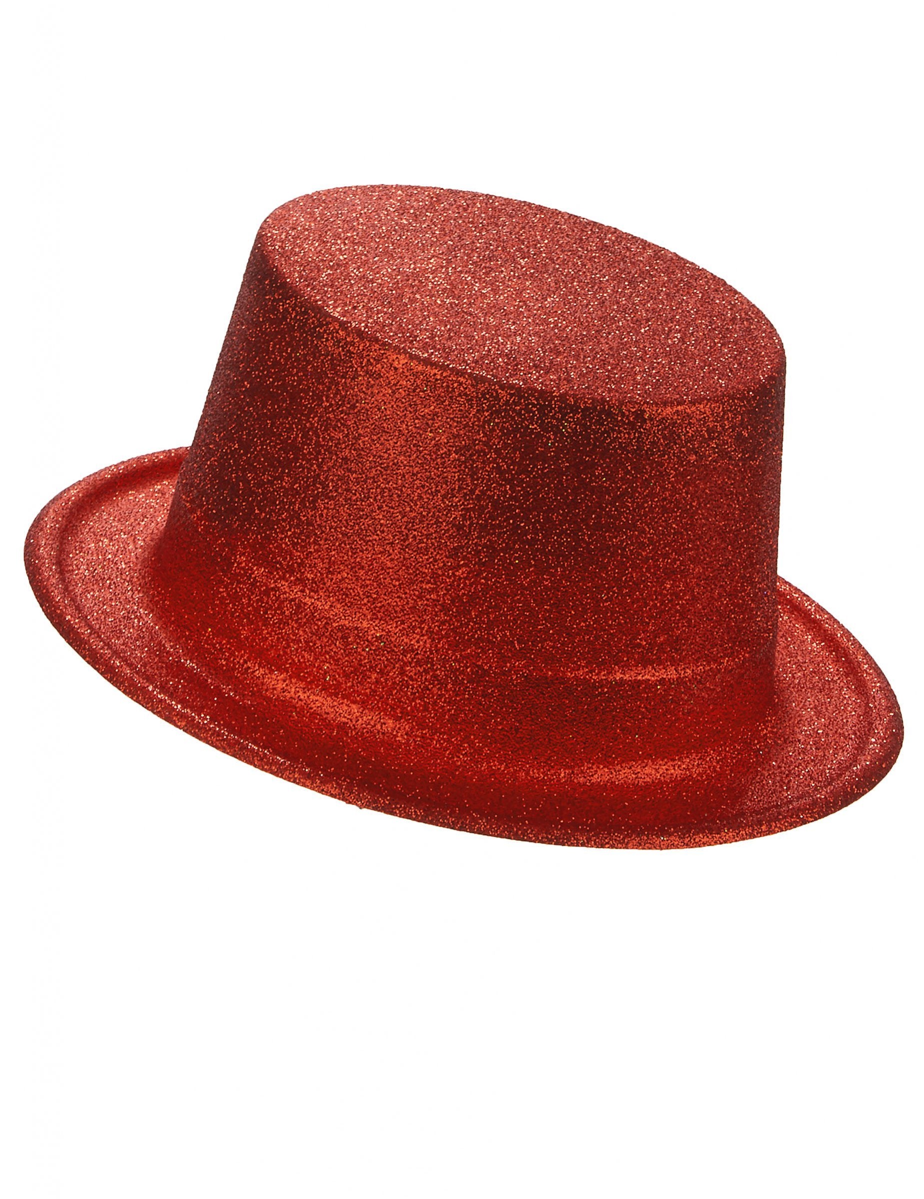 Această pălărie de top din plastic este destinată adulților. Este roșu acoperit cu sclipici. Capetele vor fi potrivite pentru aproximativ 57 cm. Perfect ca căptușeală pentru a nu trece neobservat în timpul unui eveniment deghizat de prieteni.