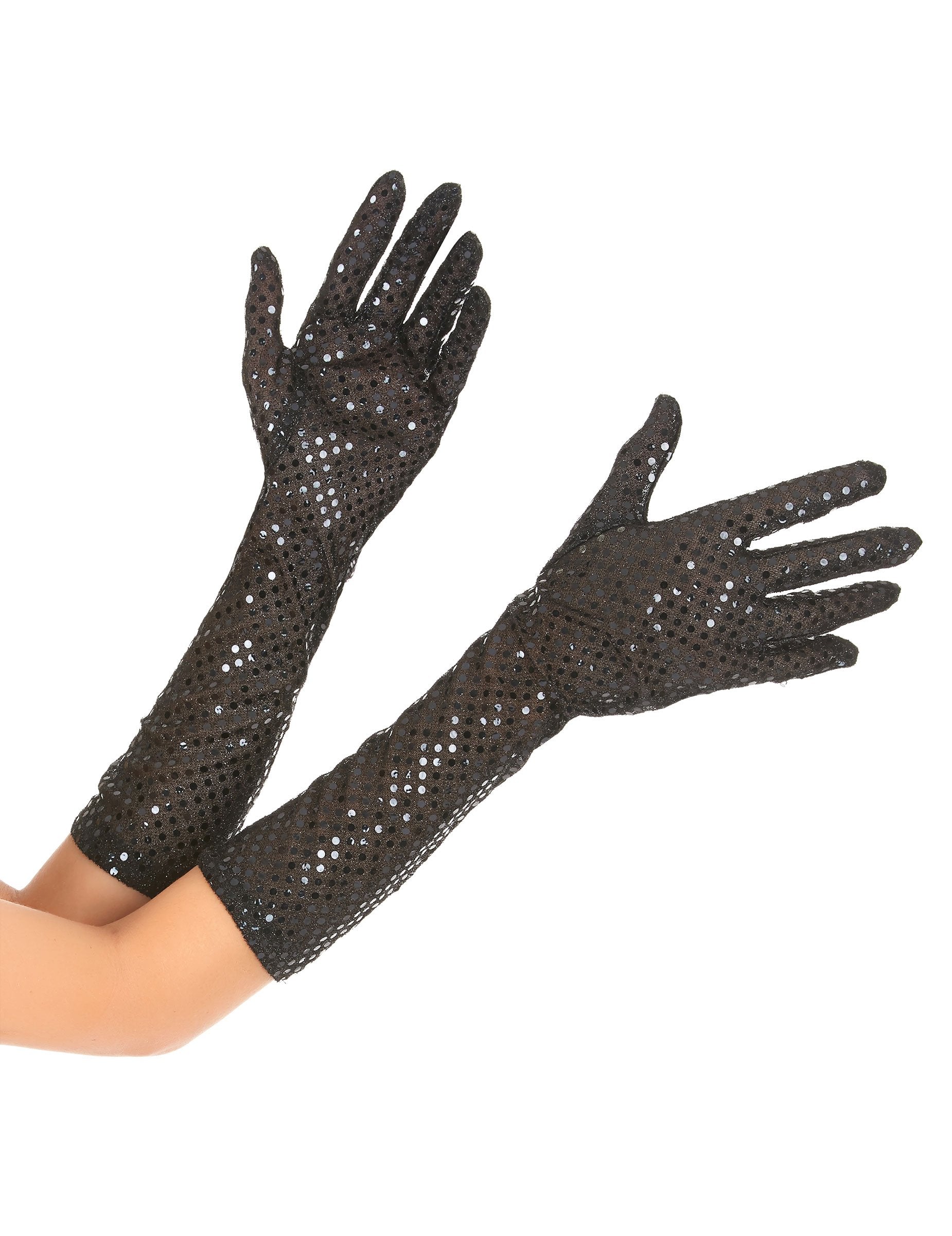 Aceste mănuși de lungime medie sunt negri și acoperit cu paieteVor fi potrivite pentru adulți și vor măsura aproximativ 30 cm de lungime.