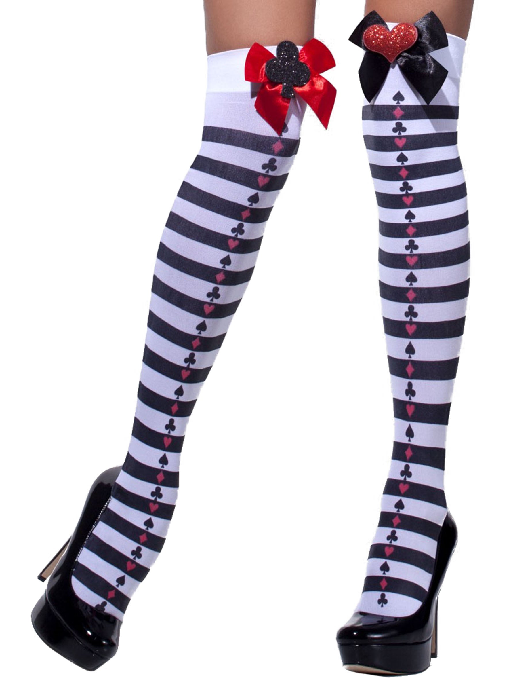 Această pereche de cărți regine cu fundul opac este destinată femeilor. El va ajunge chiar deasupra genunchiului. Sunt dungi și vârfuri alb -negru, inima, trifoiul și plăcile sunt imprimate pe partea din față și în spatele ciorapilor. Vor fi, de asemenea, prezente două noduri pe față cu un trifoi și o inimă pe un nod roșu satinat. Aceste ciorapi vor fi perfecte pentru a -ți completa costumul de inimă Queen, Queen Queen pentru Carnaval!