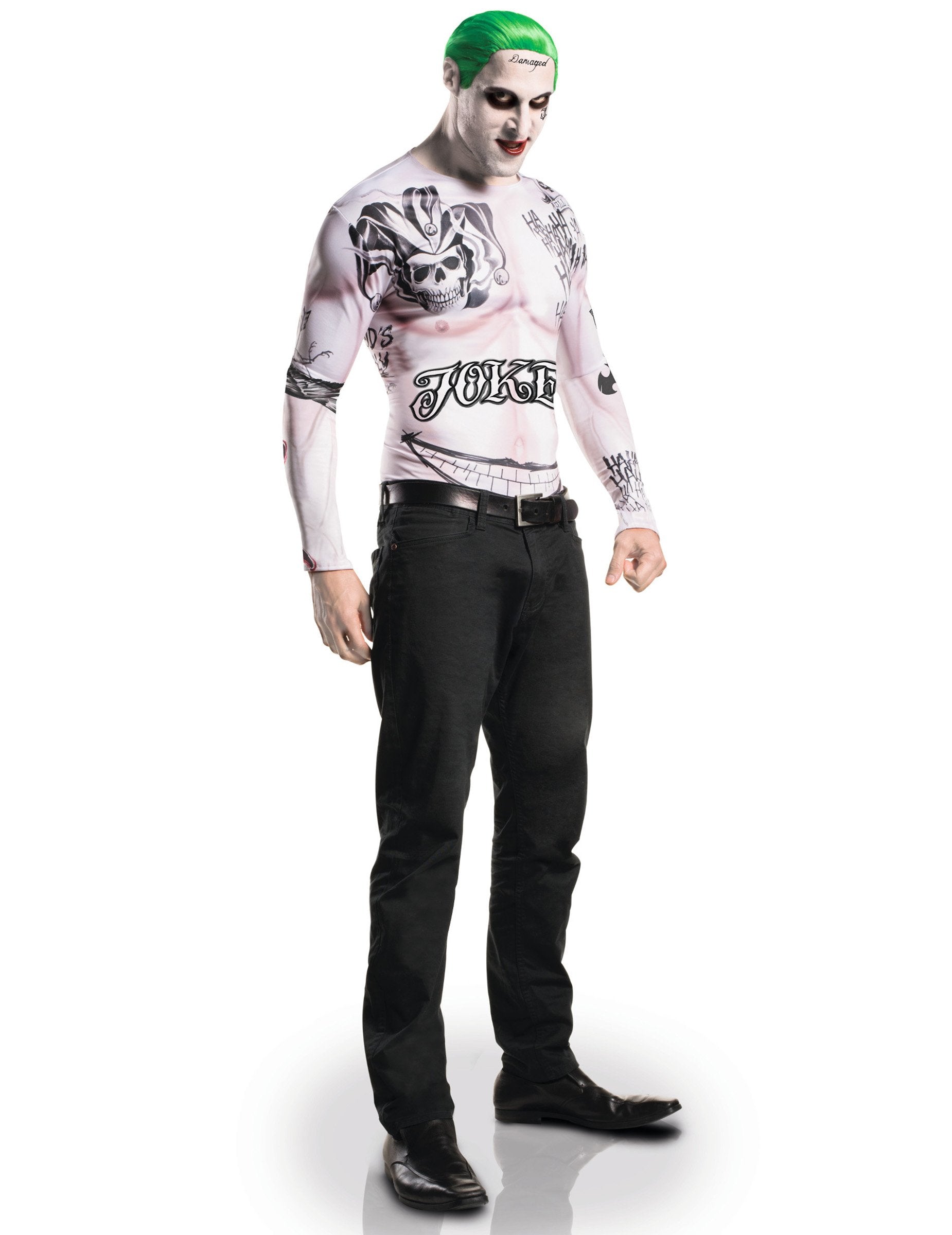 Acest costum de Joker, sub licența oficială de Suicide Squad, constă dintr-un tricou, o perucă și o paletă de machiaj (pantaloni și încălțăminte nu sunt incluse). Tricoul alb și negru este tipărit cu desene Joker și diverse inscripții pentru un efect cel mai neplăcut. Peruca verde reproduce cu fidelitate părul celebrului personaj. Paleta de machiaj este formată dintr -un tub de înroșire în cremă alb (19g), două farduri de ochi grași în paletă (6g) cu două perii de spumă pentru o aplicație ușoară, două creioane (un negru și un roșu) și două tatuaje temporare. Toate aceste elemente vor fi perfecte pentru a întruchipa faimosul dușman jurat al lui Batman!